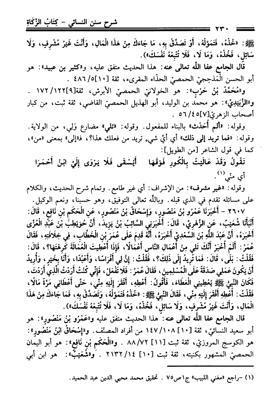 2607 - (أَخْبَرَنَا عَمْرُو بْنُ مَنْصُورٍ, وَإِسْحَاقُ بْنُ مَنْصُورٍ, عَنِ الْحَكَمِ بْنِ نَافِعٍ, قَالَ: أَنْبَأَنَا شُعَيْبٌ, عَنِ الزُّهْرِيِّ, قَالَ: أَخْبَرَنِي السَّائِبُ بْنُ يَزِيدَ, أَنَّ حُوَيْطِبَ بْنَ عَبْدِ الْعُزَّى أَخْبَرَهُ, أَنَّ عَبْدَ اللَّهِ بْنَ السَّعْدِيِّ أَخْبَرَهُ, أَنَّهُ قَدِمَ عَلَى عُمَرَ بْنِ الْخَطَّابِ, فِي خِلاَفَتِهِ, فَقَالَ عُمَرُ: أَلَمْ أُخْبَرْ أَنَّكَ تَلِى مِنْ أَعْمَالِ النَّاسِ أَعْمَالاً, فَإِذَا أُعْطِيتَ الْعُمَالَةَ كَرِهْتَهَا؟ , قَالَ: فَقُلْتُ: بَلَى, قَالَ: فَمَا تُرِيدُ إِلَى ذَلِكَ؟ , فَقُلْتُ: إِنَّ لِي أَفْرَاسًا, وَأَعْبُدًا, وَأَنَا بِخَيْرٍ, وَأُرِيدُ أَنْ يَكُونَ عَمَلِي صَدَقَةً عَلَى الْمُسْلِمِينَ, فَقَالَ عُمَرُ: فَلاَ تَفْعَلْ, فَإِنِّي كُنْتُ أَرَدْتُ الَّذِي أَرَدْتَ, فَكَانَ النَّبِيُّ - صلى اللَّه عليه وسلم - يُعْطِينِي الْعَطَاءَ, فَأَقُولُ: أَعْطِهِ, أَفْقَرَ إِلَيْهِ مِنِّي, حَتَّى أَعْطَانِي مَرَّةً مَالاً, فَقُلْتُ: أَعْطِهِ أَفْقَرَ إِلَيْهِ مِنِّي, فَقَالَ النَّبِيُّ - صلى اللَّه عليه وسلم -: «خُذْهُ فَتَمَوَّلْهُ, وَتَصَدَّقْ بِهِ, فَمَا جَاءَكَ مِنْ هَذَا الْمَالِ, وَأَنْتَ غَيْرُ مُشْرِفٍ, وَلاَ سَائِلٍ, فَخُذْهُ, وَمَا لاَ, فَلاَ تُتْبِعْهُ نَفْسَكَ»).