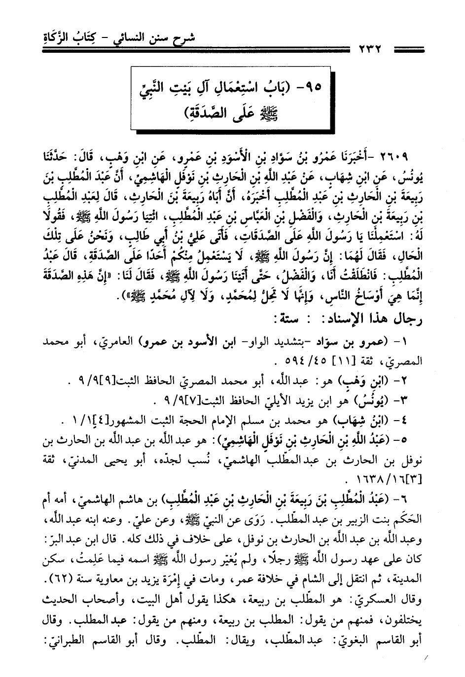 2609 - (أَخْبَرَنَا عَمْرُو بْنُ سَوَّادِ بْنِ الأَسْوَدِ بْنِ عَمْرٍو, عَنِ ابْنِ وَهْبٍ, قَالَ: حَدَّثَنَا يُونُسُ, عَنِ ابْنِ شِهَابٍ, عَنْ عَبْدِ اللَّهِ بْنِ الْحَارِثِ بْنِ نَوْفَلٍ الْهَاشِمِيِّ, أَنَّ عَبْدَ الْمُطَّلِبِ بْنَ رَبِيعَةَ بْنِ الْحَارِثِ بْنِ عَبْدِ الْمُطَّلِبِ أَخْبَرَهُ, أَنَّ أَبَاهُ رَبِيعَةَ بْنَ الْحَارِثِ, قَالَ لِعَبْدِ الْمُطَّلِبِ بْنِ رَبِيعَةَ بْنِ الْحَارِثِ, وَالْفَضْلِ بْنِ الْعَبَّاسِ بْنِ عَبْدِ الْمُطَّلِبِ, ائْتِيَا رَسُولَ اللَّهِ - صلى اللَّه عليه وسلم -, فَقُولاَ لَهُ: اسْتَعْمِلْنَا يَا رَسُولَ اللَّهِ عَلَى الصَّدَقَاتِ, فَأَتَى عَلِيُّ بْنُ أَبِي طَالِبٍ, وَنَحْنُ عَلَى تِلْكَ الْحَالِ, فَقَالَ لَهُمَا: إِنَّ رَسُولَ اللَّهِ - صلى اللَّه عليه وسلم -, لاَ يَسْتَعْمِلُ مِنْكُمْ أَحَدًا عَلَى الصَّدَقَةِ, قَالَ عَبْدُ الْمُطَّلِبِ: فَانْطَلَقْتُ أَنَا, وَالْفَضْلُ, حَتَّى أَتَيْنَا رَسُولَ اللَّهِ - صلى اللَّه عليه وسلم -, فَقَالَ لَنَا: «إِنَّ هَذِهِ الصَّدَقَةَ إِنَّمَا هِيَ أَوْسَاخُ النَّاسِ, وَإِنَّهَا لاَ تَحِلُّ لِمُحَمَّدٍ, وَلاَ لآلِ مُحَمَّدٍ - صلى اللَّه عليه وسلم -»).