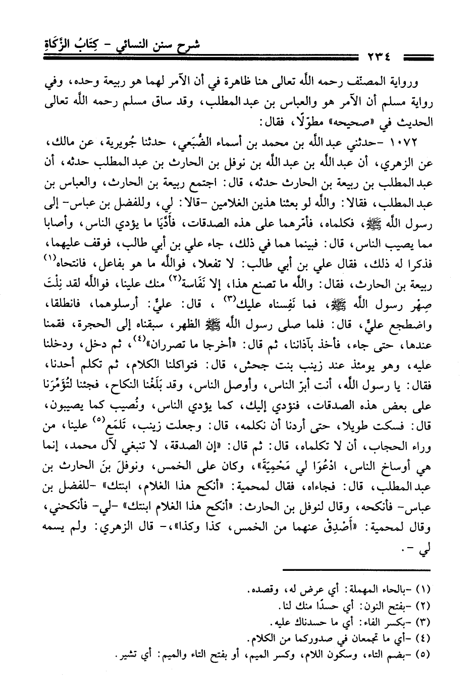 1072 - حدثني عبد اللَّه بن محمد بن أسماء الضُّبَعي، حدثنا جُويرية، عن مالك، عن الزهري، أن عبد اللَّه بن عبد اللَّه بن نوفل بن الحارث بن عبد المطلب حدثه، أن عبد المطلب بن ربيعة بن الحارث حدثه، قال: اجتمع ربيعة بن الحارث، والعباس بن عبد المطلب، فقالا: واللَّه لو بعثنا هذين الغلامين -قالا: لِي، وللفضل بن عباس- إلى رسول اللَّه - صلى اللَّه عليه وسلم -، فكلماه، فأمّرهما على هذه الصدقات، فأَدَّيَا ما يؤدي الناس، وأصابا مما يصيب الناس، قال: فبينما هما في ذلك، جاء علي بن أبي طالب، فوقف عليهما، فذكرا له ذلك، فقال عليّ بن أبي طالب: لا تفعلا، فواللَّه ما هو بفاعل، فانتحاه (¬1) ربيعة بن الحارث، فقال: واللَّه ما تصنع هذا، إلا نَفَاسة (¬2) منك علينا، فواللَّه لقد نِلْتَ صِهْر رسول اللَّه - صلى اللَّه عليه وسلم -، فما نَفِسناه عليك (¬3)، قال: عليٌّ: أرسلوهما، فانطلقا، واضطجع عليٌّ، قال: فلما صلى رسول اللَّه - صلى اللَّه عليه وسلم - الظهر، سبقناه إلى الحجرة، فقمنا عندها، حتى جاء، فأخذ بآذاننا، ثم قال: "أخرجا ما تصرران" (¬4)، ثم دخل، ودخلنا عليه، وهو يومئذ عند زينب بنت جحش، قال: فتواكلنا الكلام، ثم تكلم أحدنا، فقال: يا رسول اللَّه، أنت أبر الناس، وأوصل الناس، وقد بَلَغْنا النكاح، فجئنا لتُؤَمِّرَنا على بعض هذه الصدقات، فنؤدي إليك، كما يؤدي الناس، ونُصيب كما يصيبون، قال: فسكت طويلا، حتى أردنا أن نكلمه، قال: وجعلت زينب، تَلمَع (¬5) علينا، من وراء الحجاب، أن لا تكلماه، قال: ثم قال: "إن الصدقة، لا تنبغي لآل محمد، إنما هي أوساخ الناس، ادْعُوَا لي مَحْمِيَةَ"، وكان على الخمس، ونوفلَ بنَ الحارث بن عبد المطلب، قال: فجاءاه، فقال لمحمية: "أنكح هذا الغلام، ابنتك" -للفضل بن عباس- فأنكحه، وقال لنوفل بن الحارث: "أنكح هذا الغلام ابنتك" -لي- فأنكحني، وقال لمحمية: "أَصْدِقْ عنهما من الخمس، كذا وكذا"،- قال الزهري: ولم يسمه لي-.