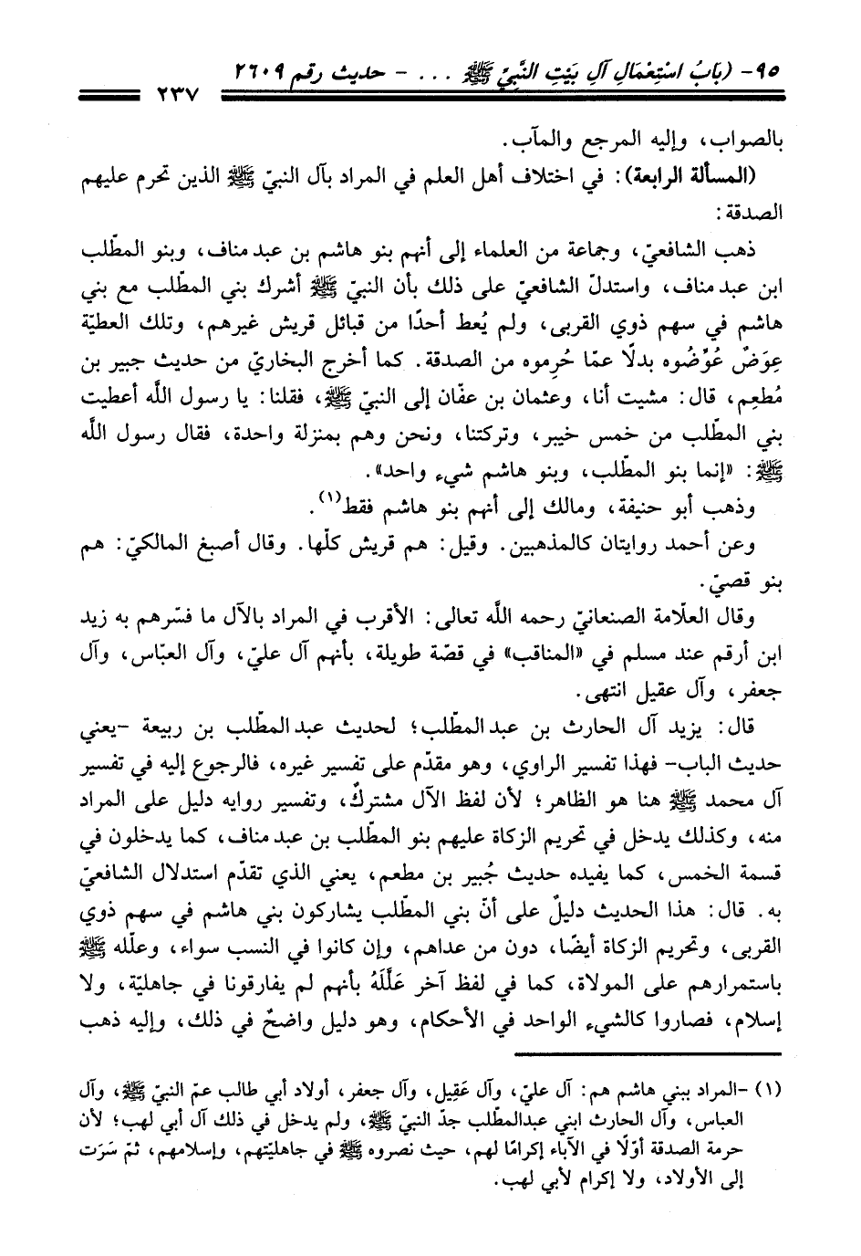 (¬1) - المراد ببني هاشم هم: آل عليّ، وآل عَقِيل، وآل جعفر، أولاد أبي طالب عمّ النبيّ - صلى اللَّه عليه وسلم -، وآل العباس، وآل الحارث ابني عبد المطّلب جدّ النبيّ - صلى اللَّه عليه وسلم -، ولم يدخل في ذلك آل أبي لهب؛ لأن حرمة الصدقة أوّلًا في الآباء إكرامًا لهم، حيث نصروه - صلى اللَّه عليه وسلم - في جاهليّتهم، وإسلامهم، ثمّ سَرَت إلى الأولاد، ولا إكرام لأبي لهب.