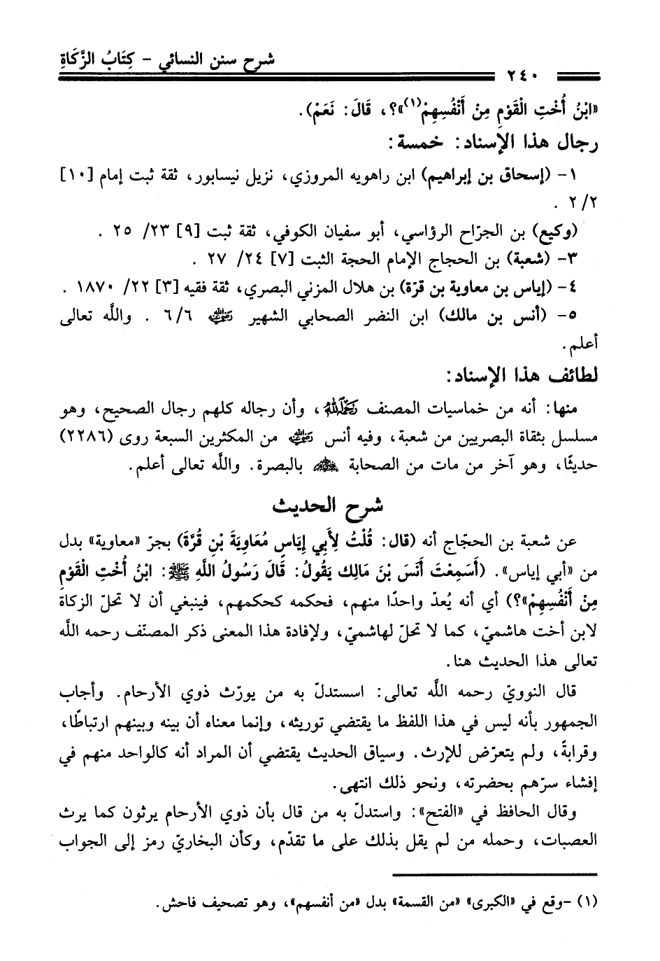 عن شعبة بن الحجّاج أنه (قال: قُلْتُ: لِأَبِي إِيَاسِ مُعَاوِيةَ بْنِ قُرَّةَ) بجرّ "معاوية" بدل من "أبي إياس". (أَسَمِعْتَ أَنسَ بْنَ مَالِك يَقُولُ: قَالَ رَسُولُ اللَّهِ - صلى اللَّه عليه وسلم -: ابْنُ أُخْتِ الْقَوْمِ مِنْ أَنْفُسِهِمْ"؟) أي أنه يُعدّ واحدًا منهم، فحكمه كحكمهم، فينبغي أن لا تحلّ الزكاة لابن أخت هاشميّ، كما لا تحلّ لهاشميّ، ولإفادة هذا المعنى ذكر المصنّف -رَحِمَهُ اللَّهُ- تعالى هذا الحديث هنا.