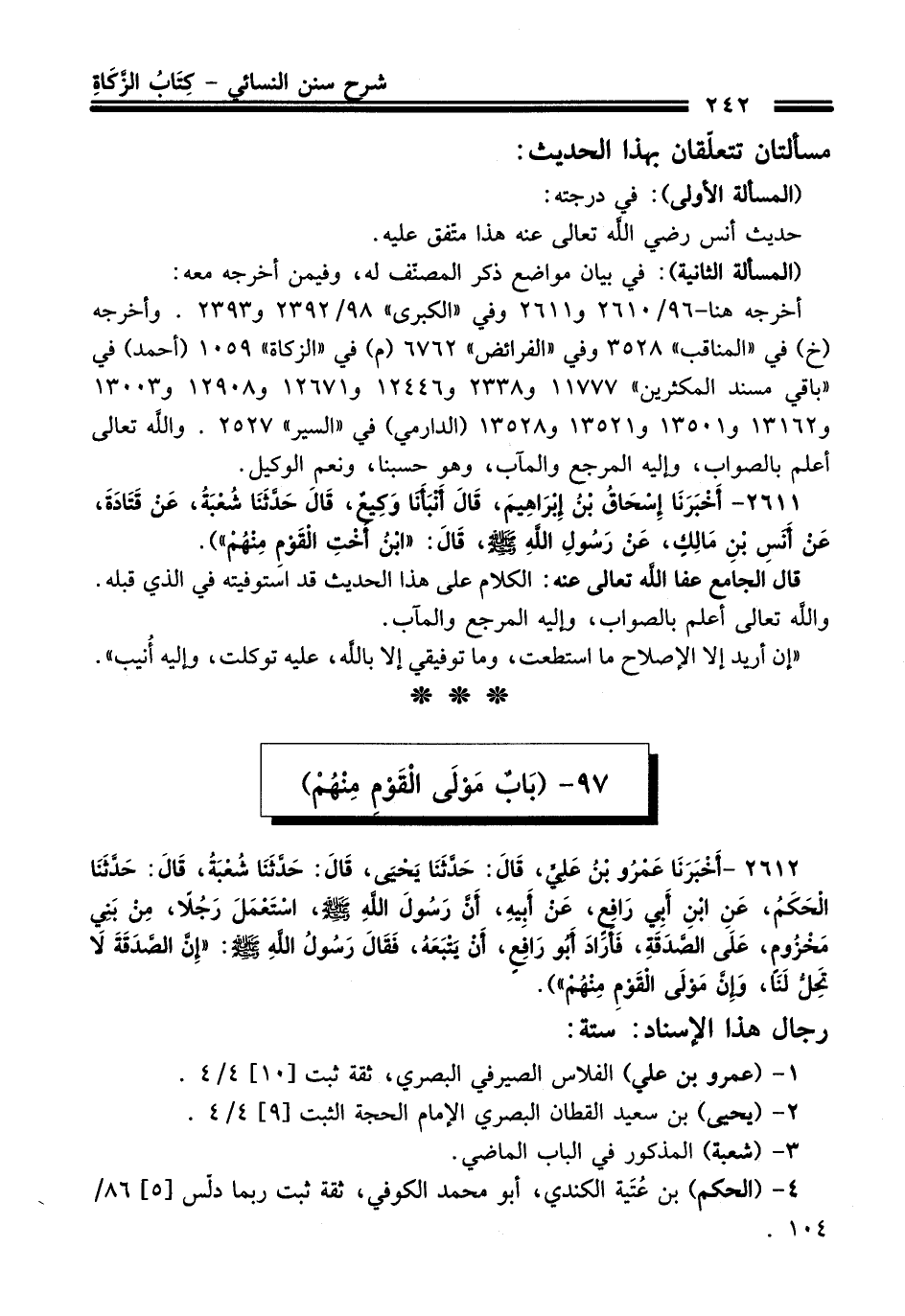 2612 - (أَخْبَرَنَا عَمْرُو بْنُ عَلِيٍّ, قَالَ: حَدَّثَنَا يَحْيَى, قَالَ: حَدَّثَنَا شُعْبَةُ, قَالَ: حَدَّثَنَا الْحَكَمُ, عَنِ ابْنِ أَبِي رَافِعٍ, عَنْ أَبِيهِ, أَنَّ رَسُولَ اللَّهِ - صلى اللَّه عليه وسلم -, اسْتَعْمَلَ رَجُلاً, مِنْ بَنِي مَخْزُومٍ, عَلَى الصَّدَقَةِ, فَأَرَادَ أَبُو رَافِعٍ, أَنْ يَتْبَعَهُ, فَقَالَ رَسُولُ اللَّهِ - صلى اللَّه عليه وسلم -: «إِنَّ الصَّدَقَةَ لاَ تَحِلُّ لَنَا, وَإِنَّ مَوْلَى الْقَوْمِ مِنْهُمْ»).