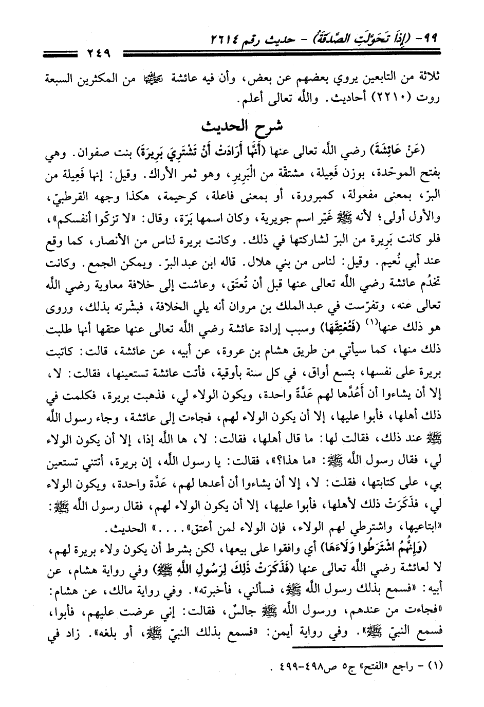 (عَنْ عَائِشَةَ) - رضي اللَّه تعالى عنها - (أَنَّهَا أَرَادَتْ أَنْ تَشْتَرِيَ بَرِيرَةَ) بنت صفوان. وهي بفتح الموحّدة، بوزن فَعِيلة، مشتقّة من الْبَرِيرِ، وهو ثمر الأراك. وقيل: إنها فَعِيلة من البرّ، بمعنى مفعولة، كمبرورة، أو بمعنى فاعلة، كرحيمة، هكذا وجهه القرطبيّ، والأول أولى؛ لأنه - صلى اللَّه عليه وسلم - غَيّر اسم جويرية، وكان اسمها بَرّة، وقال: "لا تزكّوا أنفسكم"، فلو كانت بَرِيرة من البرّ لشاركتها في ذلك. وكانت بريرة لناس من الأنصار، كما وقع عند أبي نُعيم. وقيل: لناس من بني هلال. قاله ابن عبد البرّ. ويمكن الجمع. وكانت تخدُم عائشة - رضي اللَّه تعالى عنها - قبل أن تُعتَق، وعاشت إلى خلافة معاوية - رضي اللَّه تعالى عنه -، وتفرّست في عبد الملك بن مروان أنه يلي الخلافة، فبشّرته بذلك، وروى هو ذلك عنها (¬1) (فَتُعْتِقَهَا) وسبب إرادة عائشة - رضي اللَّه تعالى عنها - عتقها أنها طلبت ذلك منها، كما سيأتي من طريق هشام بن عروة، عن أبيه، عن عائشة، قالت: كاتبت بريرة على نفسها، بتسع أواق، في كل سنة بأوقية، فأتت عائشة تستعينها، فقالت: لا، إلا أن يشاءوا أن أَعُدَّها لهم عَدَّةً واحدة، ويكون الولاء لي، فذهبت بريرة، فكلمت في ذلك أهلها، فأبوا عليها، إلا أن يكون الولاء لهم، فجاءت إلى عائشة، وجاء رسول اللَّه - صلى اللَّه عليه وسلم - عند ذلك، فقالت لها: ما قال أهلها، فقالت: لا، ها اللَّه إذا، إلا أن يكون الولاء لي، فقال رسول اللَّه - صلى اللَّه عليه وسلم -: "ما هذا؟ "، فقالت: يا رسول اللَّه، إن بريرة، أتتني تستعين بي، على كتابتها، فقلت: لا، إلا أن يشاءوا أن أعدها لهم، عَدَّة واحدة، ويكون الولاء لي، فذَكَرَتْ ذلك لأهلها، فأبوا عليها، إلا أن يكون الولاء لهم، فقال رسول اللَّه - صلى اللَّه عليه وسلم -: "ابتاعيها، واشترطي لهم الولاء، فإن الولاء لمن أعتق" .... " الحديث.