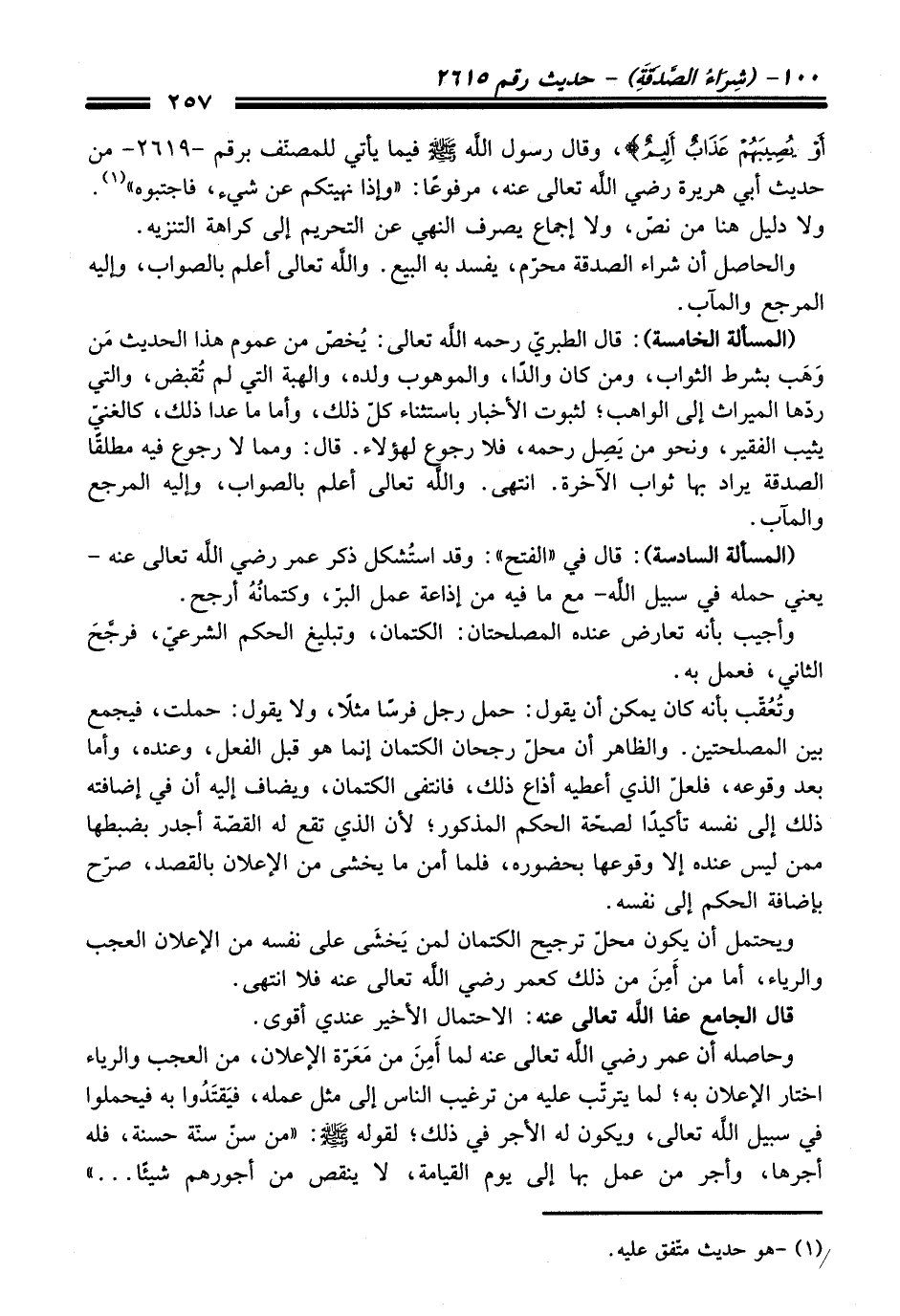(المسألة السادسة): قال في "الفتح": وقد استُشكل ذكر عمر - رضي اللَّه تعالى عنه -يعني حمله في سبيل اللَّه- مع ما فيه من إذاعة عمل البرّ، وكتمانُهُ أرجح.