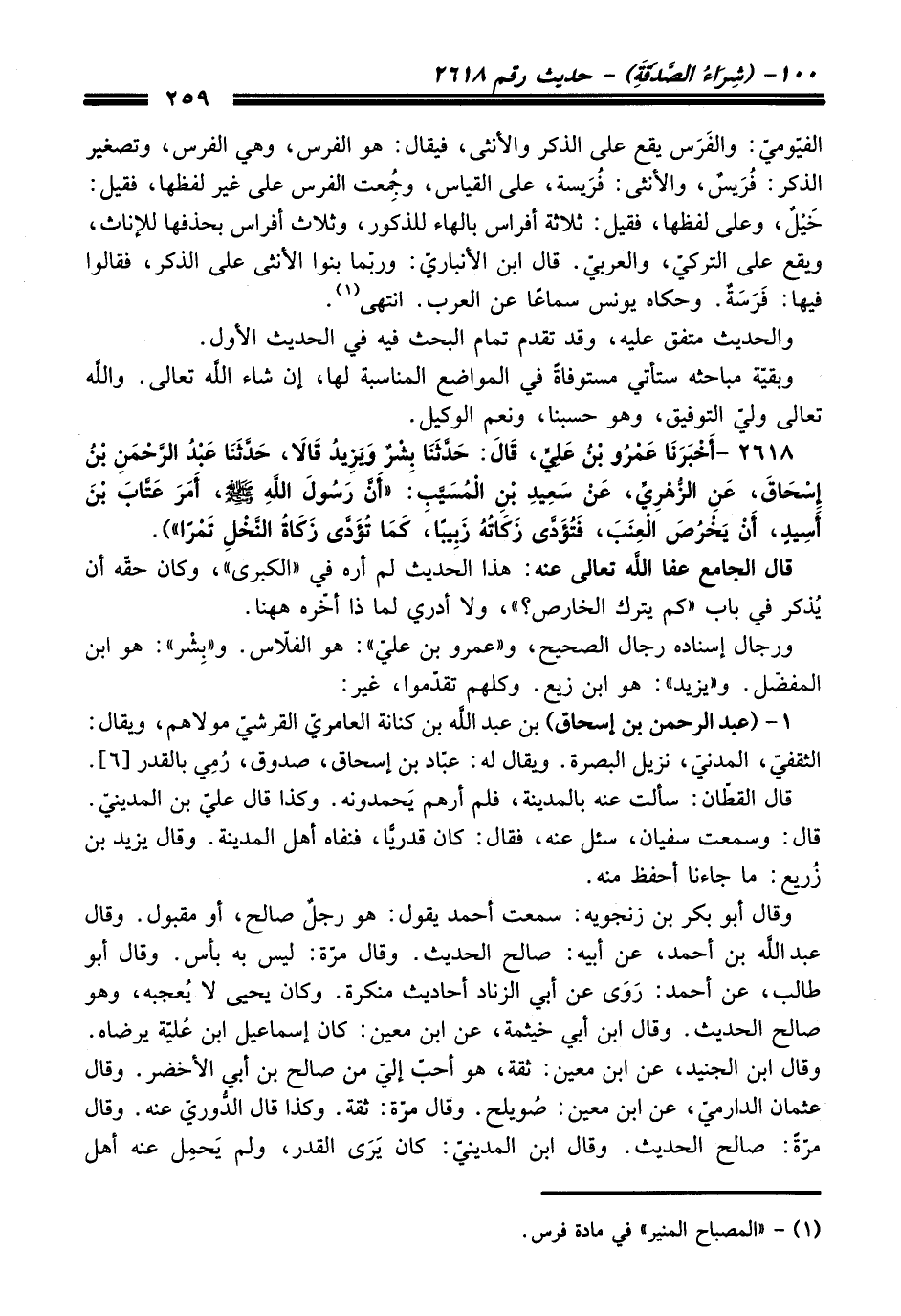 2618 - (أَخْبَرَنَا عَمْرُو بْنُ عَلِيٍّ, قَالَ: حَدَّثَنَا بِشْرٌ وَيَزِيدُ, قَالاَ: حَدَّثَنَا عَبْدُ الرَّحْمَنِ بْنُ إِسْحَاقَ, عَنِ الزُّهْرِيِّ, عَنْ سَعِيدِ بْنِ الْمُسَيَّبِ: "أَنَّ رَسُولَ اللَّهِ - صلى اللَّه عليه وسلم -, أَمَرَ عَتَّابَ بْنَ أَسِيدٍ, أَنْ يَخْرِصَ الْعِنَبَ, فَتُؤَدَّى زَكَاتُهُ زَبِيبًا, كَمَا تُؤَدَّى زَكَاةُ النَّخْلِ تَمْرًا").