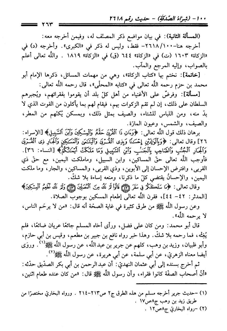 [خاتمة]: نختم بها "كتاب الزكاة"، وهي من مهمات المسائل، ذكرها الإمام أبو محمد بن حزم -رحمه اللَّه تعالى- في كتابه "المحلّى"، قال -رحمه اللَّه تعالى-: