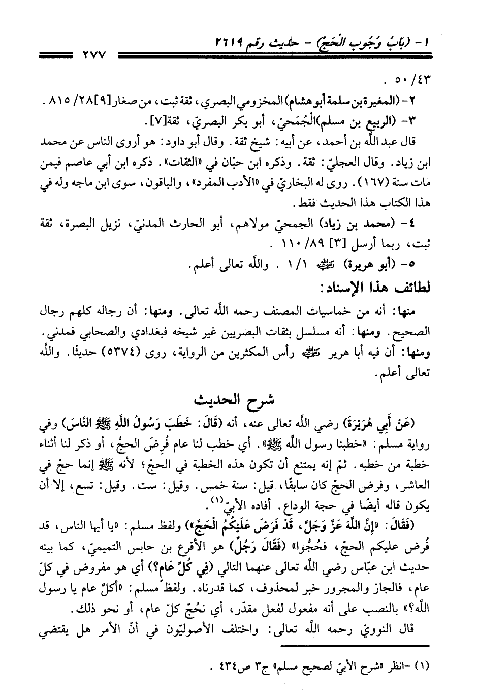 (عَنْ أَبِي هُرَيْرَةَ) - رضي اللَّه تعالى عنه -، أنه (قَالَ: خَطَبَ رَسُولُ اللَّهِ - صلى اللَّه عليه وسلم - النَّاسَ) وفي رواية مسلم: "خطبنا رسول اللَّه - صلى اللَّه عليه وسلم -". أي خطب لنا عام فُرِضَ الحجُّ، أو ذكر لنا أثناء خطبة من خطبه. ثمّ إنه يمتنع أن تكون هذه الخطبة في الحجّ؛ لأنه - صلى اللَّه عليه وسلم - إنما حجّ في العاشر، وفرض الحجّ كان سابقًا، قيل: سنة خمس. وقيل: ست. وقيل: تسع، إلا أن يكون قاله أيضًا في حجة الوداع. أفاده الأبيّ (¬1).