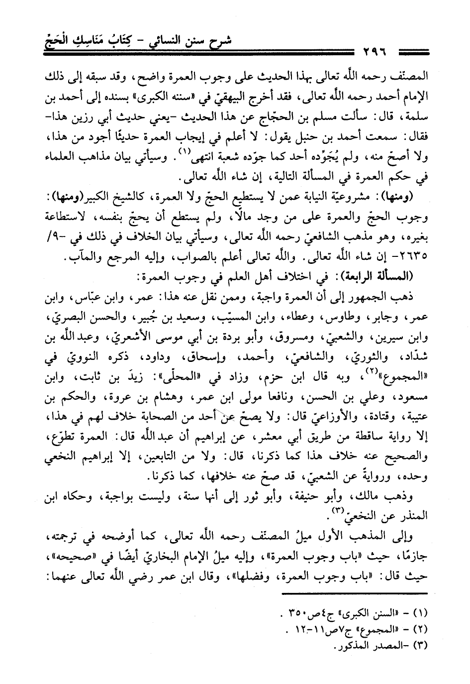 ذهب الجمهور إلى أن العمرة واجبة، وممن نقل عنه هذا: عمر، وابن عبّاس، وابن عمر، وجابر، وطاوس، وعطاء، وابن المسيّب، وسعيد بن جُبير، والحسن البصريّ، وابن سيرين، والشعبيّ، ومسروق، وأبو بردة بن أبي موسى الأشعريّ، وعبد اللَّه بن شدّاد، والثوريّ، والشافعيّ، وأحمد، وإسحاق، وداود، ذكره النوويّ في "المجموع" (¬2)، وبه قال ابن حزم، وزاد في "المحلّى": زيدَ بن ثابت، وابن مسعود، وعلي بن الحسن، ونافعا مولى ابن عمر، وهشام بن عروة، والحكم بن عتيبة، وقتادة، والأوزاعيّ قال: ولا يصحّ عن أحد من الصحابة خلاف لهم في هذا، إلا رواية ساقطة من طريق أبي معشر، عن إبراهيم أن عبد اللَّه قال: العمرة تطوّع، والصحيح عنه خلاف هذا كما ذكرنا، قال: ولا من التابعين، إلا إبراهيم النخعي وحده، وروايةً عن الشعبيّ، قد صحّ عنه خلافها، كما ذكرنا.