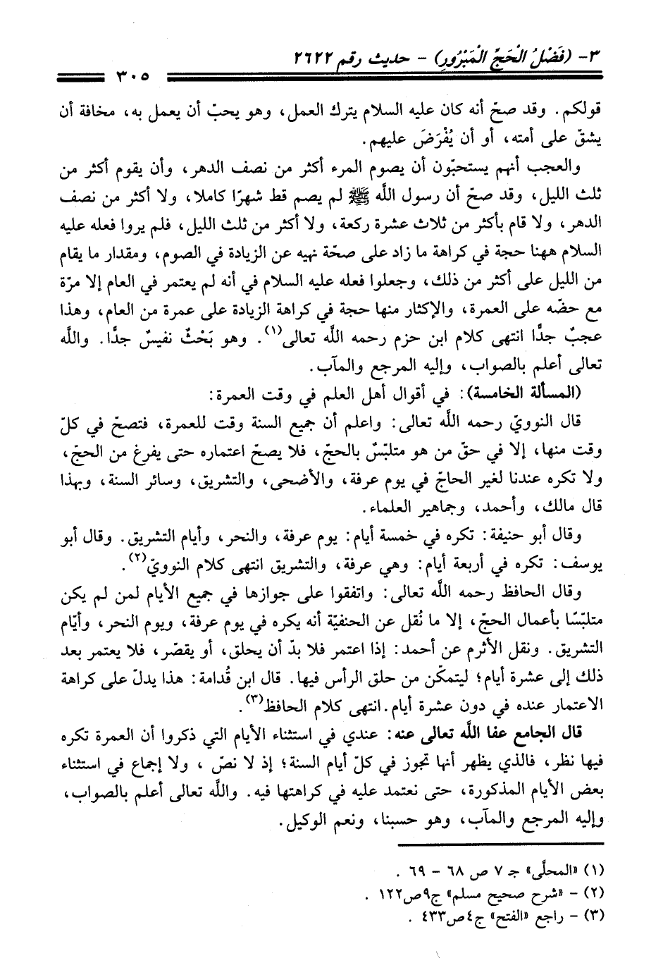 والعجب أنهم يستحبون أن يصوم المرء أكثر من نصف الدهر، وأن يقوم أكثر من ثلث الليل، وقد صحّ أن رسول اللَّه - صلى اللَّه عليه وسلم - لم يصم قط شهرًا كاملا، ولا أكثر من نصف الدهر، ولا قام بأكثر من ثلاث عشرة ركعة، ولا أكثر من ثلث الليل، فلم يروا فعله عليه السلام ههنا حجة في كراهة ما زاد على صحّة نهيه عن الزيادة في الصوم، ومقدار ما يقام من الليل على أكثر من ذلك، وجعلوا فعله - عليه السلام - في أنه لم يعتمر في العام إلا مرّة مع حضّه على العمرة، والإكثار منها حجة في كراهة الزيادة على عمرة من العام، وهذا عجبٌ جدًّا انتهى كلام ابن حزم -رحمه اللَّه تعالى- (¬1). وهو بَحْثٌ نفيسٌ جدًّا. واللَّه تعالى أعلم بالصواب، وإليه المرجع والمآب.
