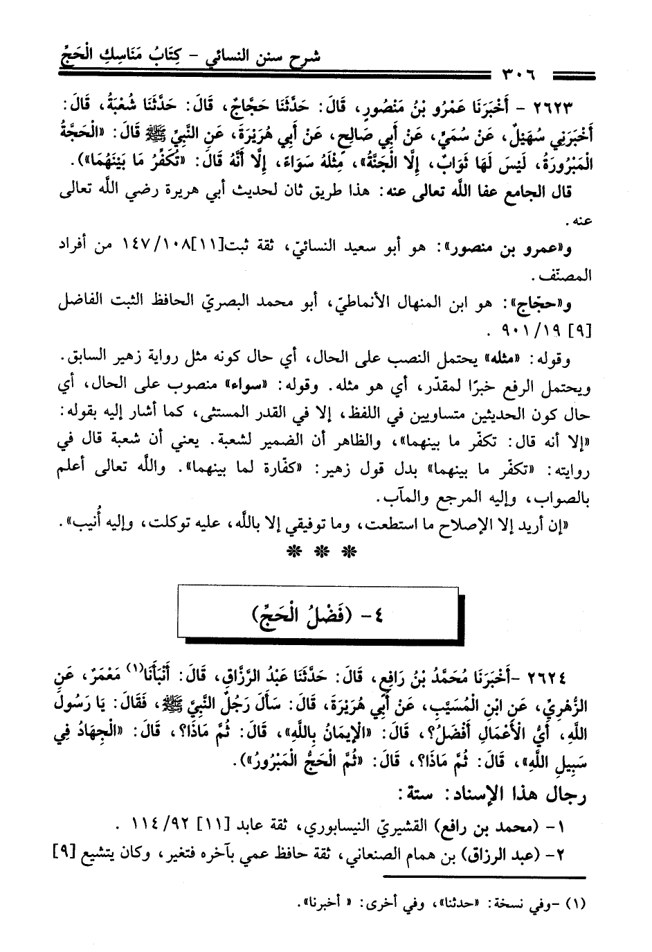 2623 - (أَخْبَرَنَا عَمْرُو بْنُ مَنْصُورٍ, قَالَ: حَدَّثَنَا حَجَّاجٌ, قَالَ: حَدَّثَنَا شُعْبَةُ,, قَالَ: أَخْبَرَنِي سُهَيْلٌ عَنْ سُمَيٍّ, عَنْ أَبِي صَالِحٍ, عَنْ أَبِي هُرَيْرَةَ,, عَنِ النَّبِيِّ - صلى اللَّه عليه وسلم - قَالَ: «الْحَجَّةُ الْمَبْرُورَةُ, لَيْسَ لَهَا ثَوَابٌ, إِلاَّ الْجَنَّةُ» , مِثْلَهُ سَوَاءً, إِلاَّ أَنَّهُ قَالَ: «تُكَفِّرُ مَا بَيْنَهُمَا»).