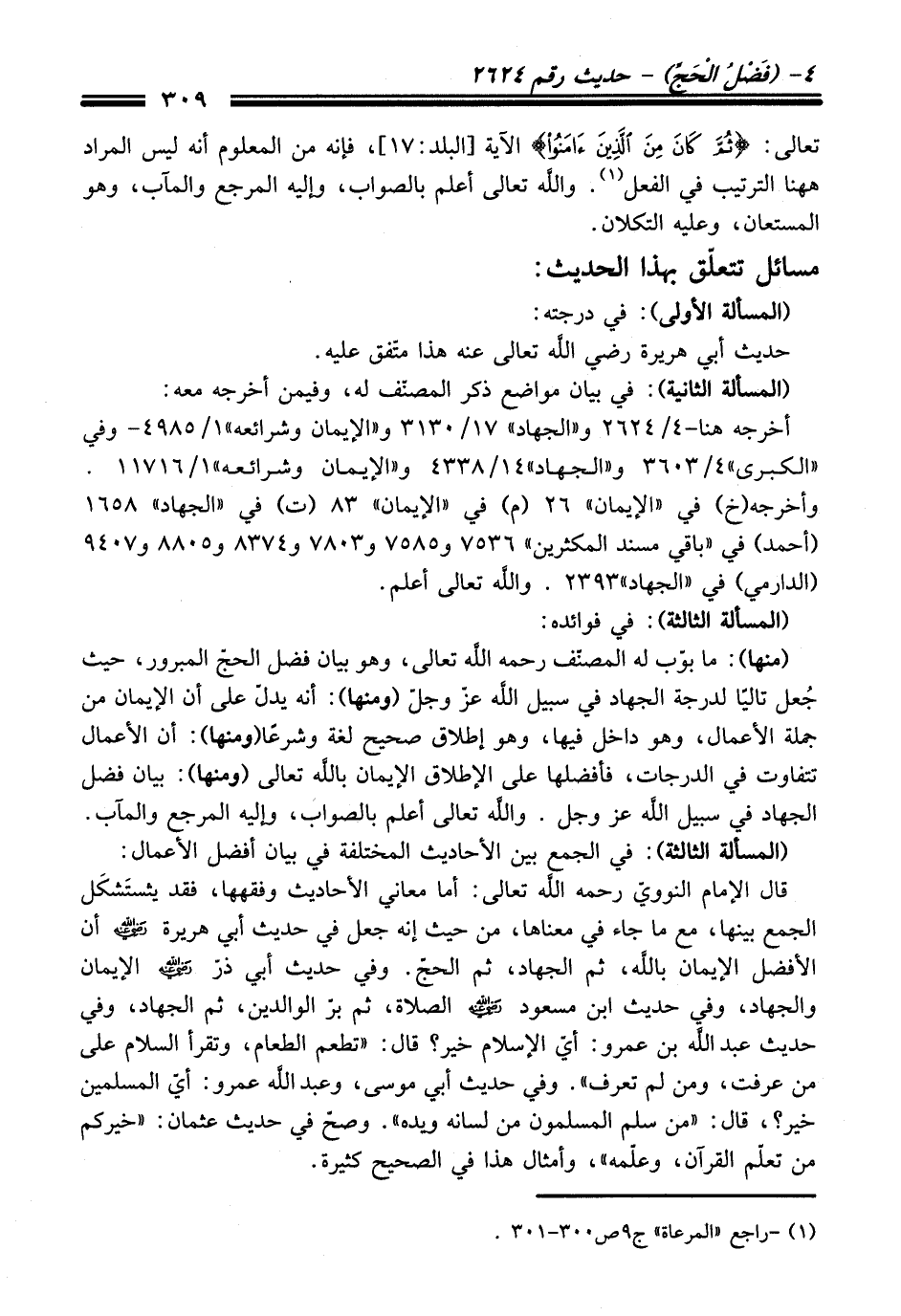 قال الإمام النوويّ -رحمه اللَّه تعالى-: أما معاني الأحاديث وفقهها، فقد يُستَشكَل الجمع بينها، مع ما جاء في معناها، من حيث إنه جعل في حديث أبي هريرة - رضي اللَّه عنه - أن الأفضل الإيمان باللَّه، ثم الجهاد، ثم الحجّ. وفي حديث أبي ذرّ - رضي اللَّه عنه - الإيمان والجهاد، وفي حديث ابن مسعود - رضي اللَّه عنه - الصلاة، ثم برّ الوالدين، ثم الجهاد، وفي حديث عبد اللَّه بن عمرو: أيّ الإسلام خير؟ قال: "تطعم الطعام، وتقرأ السلام على من عرفت، ومن لم تعرف". وفي حديث أبي موسى، وعبد اللَّه عمرو: أيّ المسلمين خير؟، قال: "من سلم المسلمون من لسانه ويده". وصحّ في حديث عثمان: "خيركم من تعلّم القرآن، وعلّمه"، وأمثال هذا في الصحيح كثيرة.