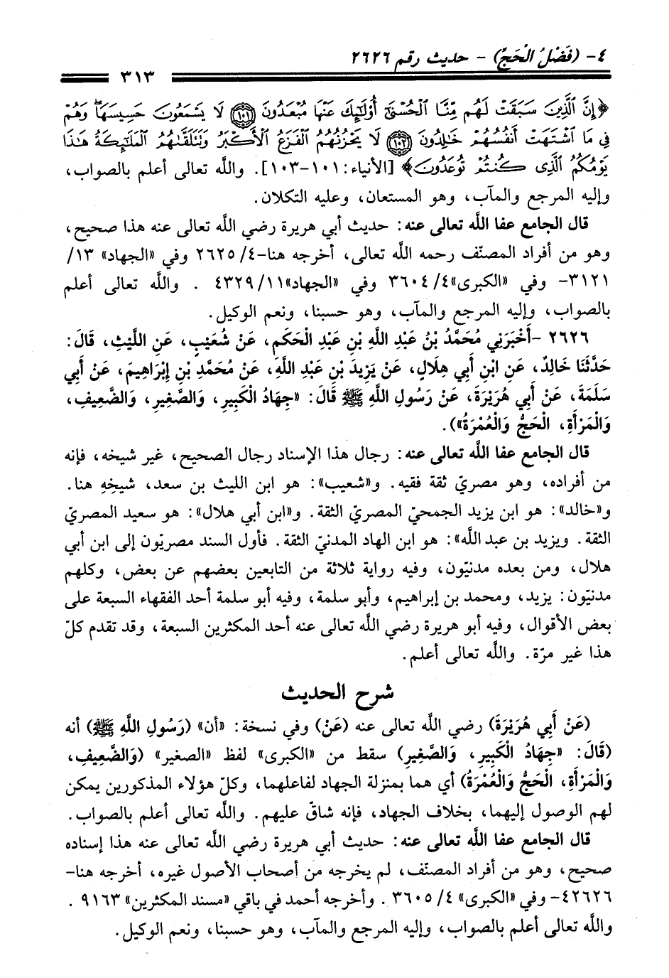 2626 - (أَخْبَرَنِي مُحَمَّدُ بْنُ عَبْدِ اللَّهِ بْنِ عَبْدِ الْحَكَمِ, عَنْ شُعَيْبٍ, عَنِ اللَّيْثِ, قَالَ: حَدَّثَنَا خَالِدٌ, عَنِ ابْنِ أَبِي هِلاَلٍ, عَنْ يَزِيدَ بْنِ عَبْدِ اللَّهِ, عَنْ مُحَمَّدِ بْنِ إِبْرَاهِيمَ, عَنْ أَبِي سَلَمَةَ, عَنْ أَبِي هُرَيْرَةَ, عَنْ رَسُولِ اللَّهِ - صلى اللَّه عليه وسلم - قَالَ: «جِهَادُ الْكَبِيرِ, وَالصَّغِيرِ, وَالضَّعِيفِ, وَالْمَرْأَةِ, الْحَجُّ وَالْعُمْرَةُ»).