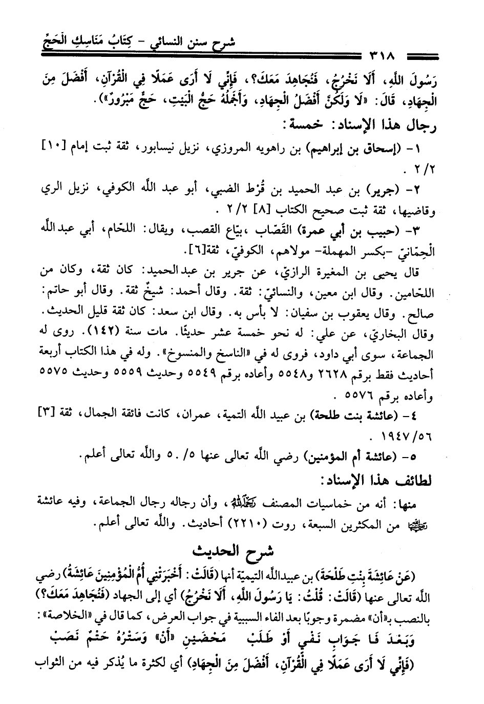 رَسُولَ اللَّهِ, أَلاَ نَخْرُجُ, فَنُجَاهِدَ مَعَكَ؟ , فَإِنِّي لاَ أَرَى عَمَلاً فِي الْقُرْآنِ, أَفْضَلَ مِنَ الْجِهَادِ, قَالَ: «لاَ وَلَكُنَّ أَحْسَنُ الْجِهَادِ, وَأَجْمَلُهُ حَجُّ الْبَيْتِ, حَجٌّ مَبْرُورٌ»).