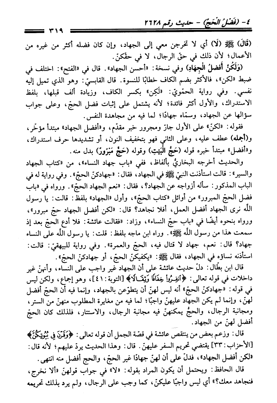 قال الحافظ: ويحتمل أن يكون المراد بقوله: "لا" في جواب قولهنّ "ألا نخرج، فنجاهد معك؟ " أي ليس واجبًا عليكنّ، كما وجب على الرجال، ولم يرد بذلك تحريمه