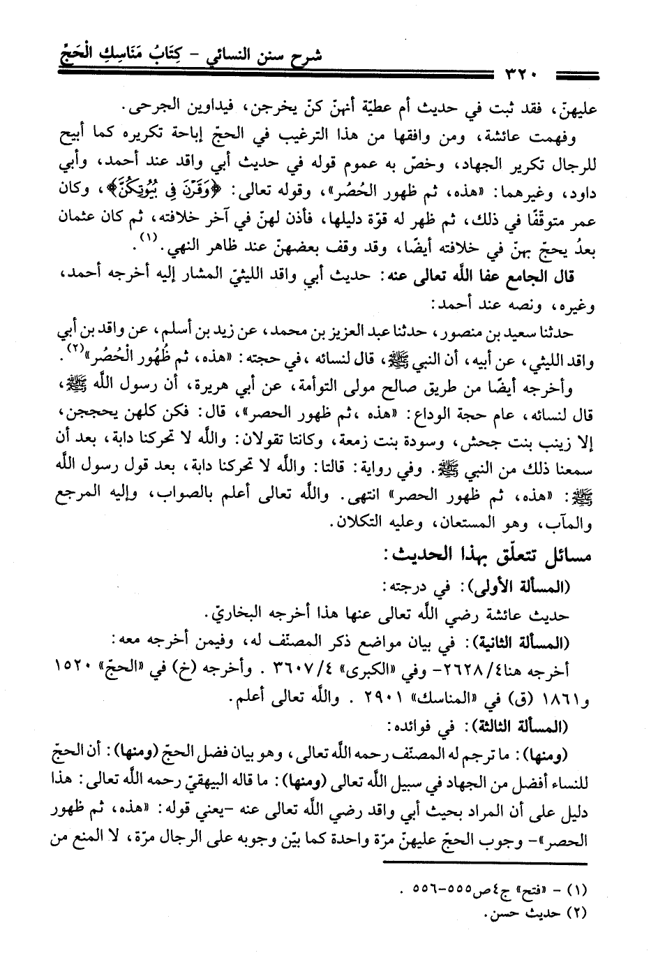 وأخرجه أيضًا من طريق صالح مولى التوأمة، عن أبي هريرة، أن رسول اللَّه - صلى اللَّه عليه وسلم -، قال لنسائه، عام حجة الوداع: "هذه، ثم ظهور الحصر، قال: فكن كلهن يحججن، إلا زينب بنت جحش، وسودة بنت زمعة، وكانتا تقولان: واللَّه لا تحركنا دابة، بعد أن سمعنا ذلك من النبي - صلى اللَّه عليه وسلم -. وفي رواية: قالتا: واللَّه لا تحركنا دابة، بعد قول رسول اللَّه - صلى اللَّه عليه وسلم -: "هذه، ثم ظهور الحصر" انتهى. واللَّه تعالى أعلم بالصواب، وإليه المرجع والمآب، وهو المستعان، وعليه التكلان.