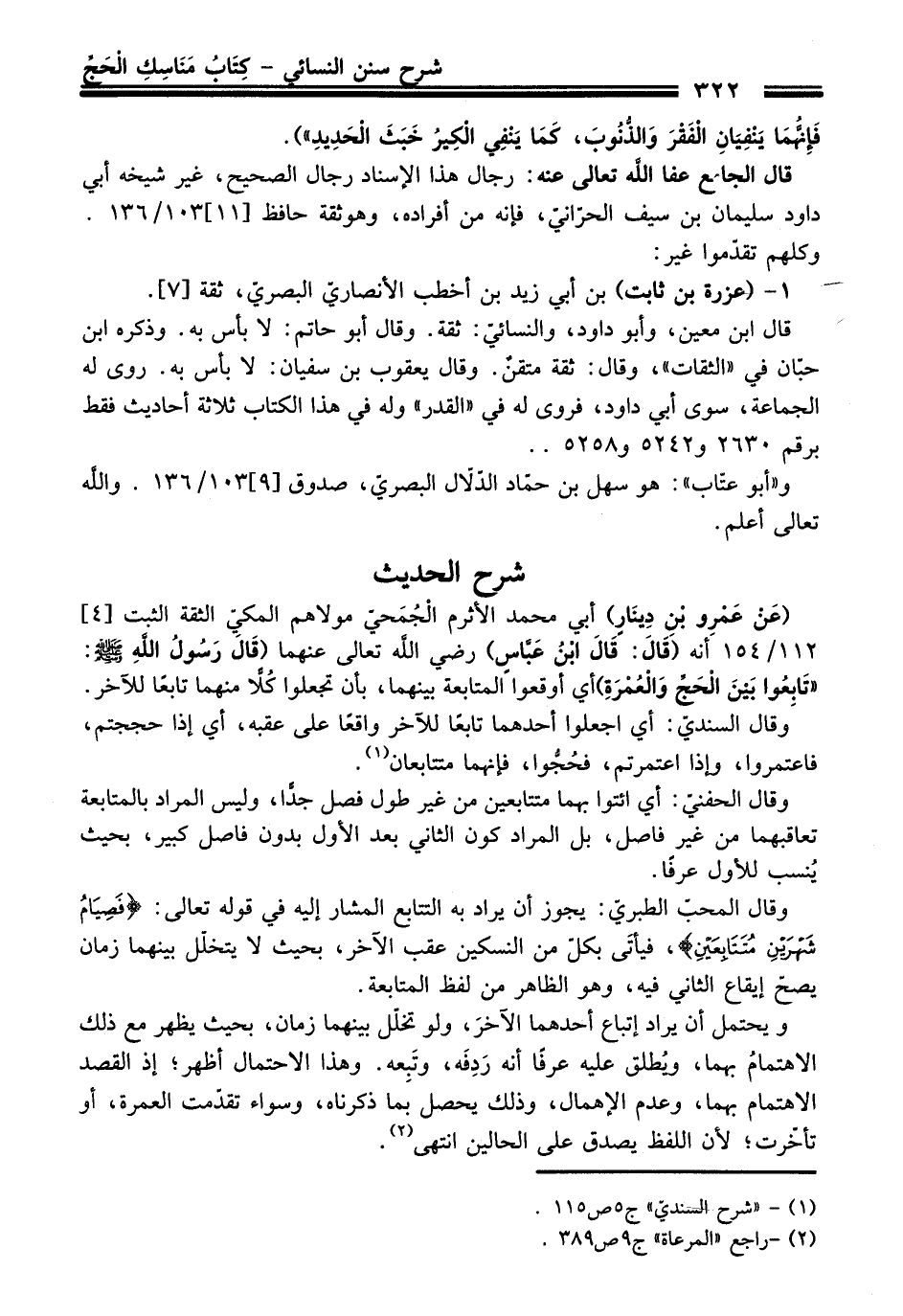 وقال السنديّ: أي اجعلوا أحدهما تابعاً للآخر واقعًا على عقبه، أي إذا حججتم، فاعتمروا، وإذا اعتمرتم، فحُجُّوا، فإنهما متتابعان (¬1).
