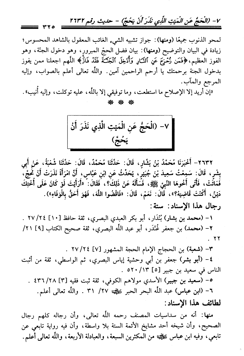 2632 - (أَخْبَرَنَا مُحَمَّدُ بْنُ بَشَّارٍ, قَالَ: حَدَّثَنَا مُحَمَّدٌ, قَالَ: حَدَّثَنَا شُعْبَةُ, عَنْ أَبِي بِشْرٍ, قَالَ: سَمِعْتُ سَعِيدَ بْنَ جُبَيْرٍ, يُحَدِّثُ عَنِ ابْنِ عَبَّاسٍ, أَنَّ امْرَأَةً نَذَرَتْ أَنْ تَحُجَّ, فَمَاتَتْ, فَأَتَى أَخُوهَا النَّبِيَّ - صلى اللَّه عليه وسلم -, فَسَأَلَهُ عَنْ ذَلِكَ؟ , فَقَالَ: «أَرَأَيْتَ لَوْ كَانَ عَلَى أُخْتِكَ دَيْنٌ, أَكُنْتَ قَاضِيَهُ؟» , قَالَ: نَعَمْ, قَالَ: «فَاقْضُوا اللَّهَ, فَهُوَ أَحَقُّ بِالْوَفَاءِ»).