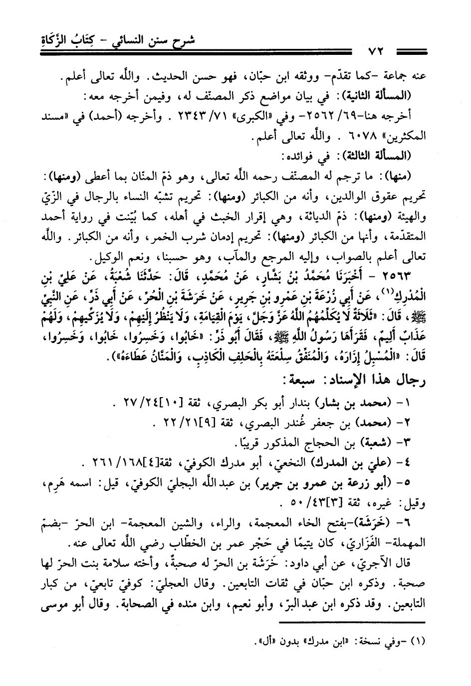 2563 - (أَخْبَرَنَا مُحَمَّدُ بْنُ بَشَّارٍ, عَنْ مُحَمَّدٍ, قَالَ: حَدَّثَنَا شُعْبَةُ, عَنْ عَلِيِّ بْنِ الْمُدْرِكِ (¬1) , عَنْ أَبِي زُرْعَةَ بْنِ عَمْرِو بْنِ جَرِيرٍ, عَنْ خَرَشَةَ بْنِ الْحُرِّ, عَنْ أَبِي ذَرٍّ, عَنِ النَّبِيِّ - صلى اللَّه عليه وسلم -, قَالَ: «ثَلاَثَةٌ لاَ يُكَلِّمُهُمُ اللَّهُ -عَزَّ وَجَلَّ-, يَوْمَ الْقِيَامَةِ, وَلاَ يَنْظُرُ إِلَيْهِمْ, وَلاَ يُزَكِّيهِمْ, وَلَهُمْ عَذَابٌ أَلِيمٌ, فَقَرَأَهَا رَسُولُ اللَّهِ - صلى اللَّه عليه وسلم -, فَقَالَ أَبُو ذَرٍّ: "خَابُوا, وَخَسِرُوا, خَابُوا, وَخَسِرُوا, قَالَ: «الْمُسْبِلُ إِزَارَهُ, وَالْمُنَفِّقُ سِلْعَتَهُ بِالْحَلِفِ الْكَاذِبِ, وَالْمَنَّانُ عَطَاءَهُ").