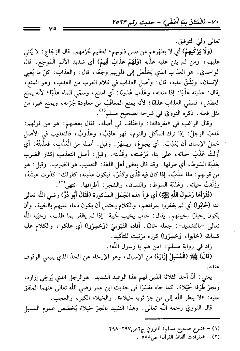يعني: أنّ أحد الثلاثة الذين لهم هذا الوعيد الشديد: هوالرجل الذي يُرخِي إزاره، ويجرّ طَرَفه خُيَلاءً، كما جاء مفسّرًا في حديث ابن عمر - رضي اللَّه تعالى عنهما - المتّفق عليه: "لا ينظر اللَّه إلى من جرّ ثوبه خيلاء". والخيلاء الكبر، والعجب.