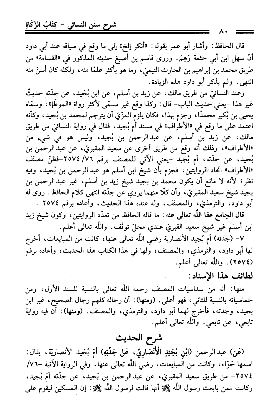وعند النسائيّ من طريق مالك، عن زيد بن أسلم، عن ابن بُجَيد، عن جدّته حديثٌ غير هذا -يعني حديث الباب- قال: وكذا وقع غير مسمّى لأكثر رواة "الموطّإ"، وسمّاه يحيى بن بُكير محمدًا، وجزم بهذا، فكان يلزم المزّيّ أن يترجم لمحمد بن بُجيد، وكأنه اعتمد على ما وقع في "الأطراف" في مسند أم بُجيد، فقال في رواية النسائيّ من طريق مالك، عن زيد بن أسلم، عن عبد الرحمن بن بُجيد، وليس هو في شيء من "الأطراف"، وذلك أنه وقع من طريق أخرى عن سعيد المقبريّ، عن عبد الرحمن بن بُجيد، عن جدّته، أم بُجيد -يعني الآتي للمصنف برقم 76/ 2574 - فظنّ مصنّف "الأطراف" اتحاد الروايتين، فجزم بأن شيخ ابن أسلم هو عبد الرحمن بن بُجيد، وفيه نظر؛ لأنه لا مانع أن يكون محمد بن بجيد شيخ زيد بن أسلم، غير عبد الرحمن بن بجيد شيخ سعيد المقبريّ، وأن كلاّ منهما يروي عن جدّته انتهى كلام الحافظ. روى له أبو داود، والترمذيّ، والمصنّف، وله عنده هذا الحديث، وأعاده برقم 2574.