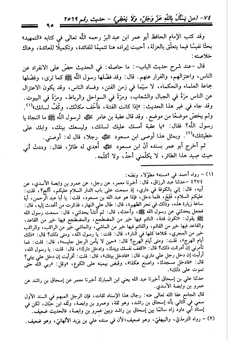 ثم أخرج أبو عمر بسنده أنّ ابن مسعود - رضي اللَّه عنه - أُهدي له طائرٌ، فقال: وددتُ أني حيث صِيد هذا الطائر، لا يكلّمني أحدٌ، ولا أكلّمه.