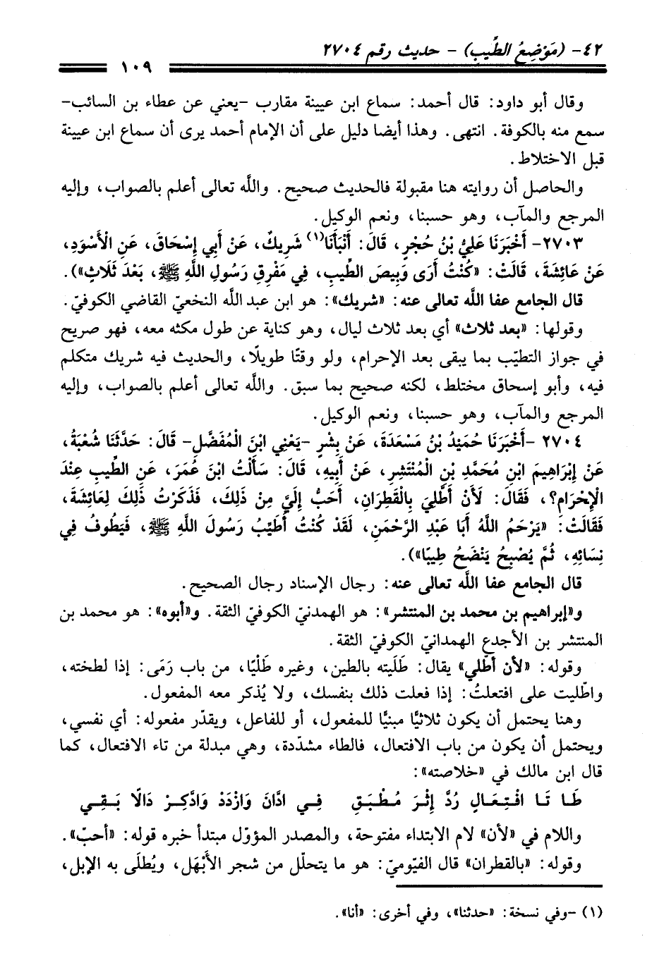 2704 - (أَخْبَرَنَا حُمَيْدُ بْنُ مَسْعَدَةَ, عَنْ بِشْرٍ -يَعْنِي ابْنَ الْمُفَضَّلِ- قَالَ: حَدَّثَنَا شُعْبَةُ, عَنْ إِبْرَاهِيمَ بْنِ مُحَمَّدِ بْنِ الْمُنْتَشِرِ, عَنْ أَبِيهِ, قَالَ: سَأَلْتُ ابْنَ عُمَرَ, عَنِ الطِّيبِ عِنْدَ الإِحْرَامِ؟ , فَقَالَ: لأَنْ أَطَّلِيَ بِالْقَطِرَانِ, أَحَبُّ إِلَيَّ مِنْ ذَلِكَ, فَذَكَرْتُ ذَلِكَ لِعَائِشَةَ, فَقَالَتْ: "يَرْحَمُ اللَّهُ أَبَا عَبْدِ الرَّحْمَنِ, لَقَدْ كُنْتُ أُطَيِّبُ رَسُولَ اللَّهِ - صلى اللَّه عليه وسلم -, فَيَطُوفُ فِي نِسَائِهِ, ثُمَّ يُصْبِحُ يَنْضَحُ طِيبًا").