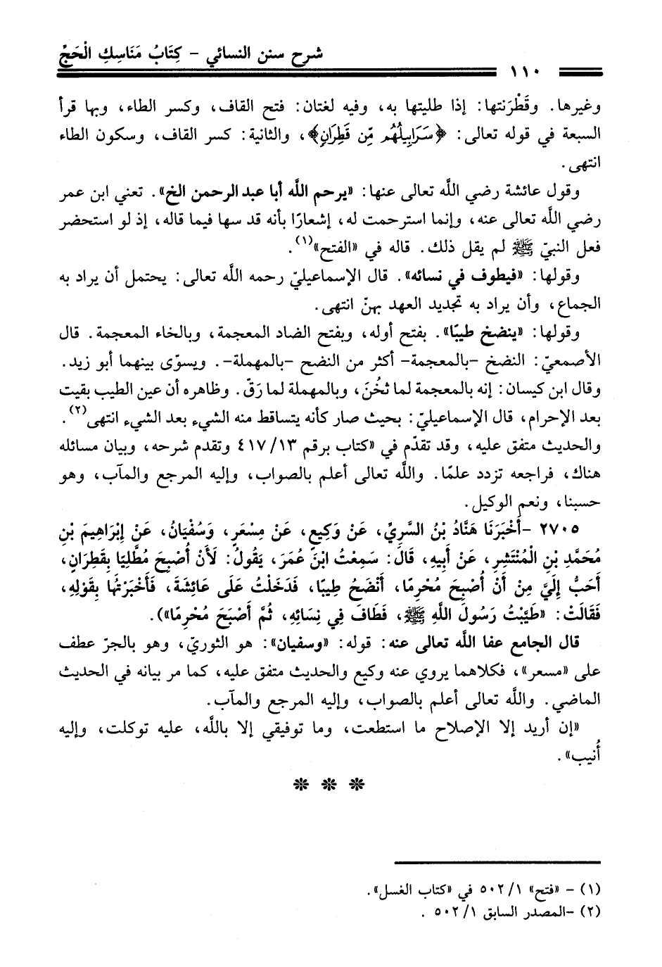 2705 - (أَخْبَرَنَا هَنَّادُ بْنُ السَّرِيِّ, عَنْ وَكِيعٍ, عَنْ مِسْعَرٍ, وَسُفْيَانَ, عَنْ إِبْرَاهِيمَ بْنِ مُحَمَّدِ بْنِ الْمُنْتَشِرِ, عَنْ أَبِيهِ, قَالَ: سَمِعْتُ ابْنَ عُمَرَ, يَقُولُ: لأَنْ أُصْبِحَ مُطَّلِيًا بِقَطِرَانٍ, أَحَبُّ إِلَيَّ مِنْ أَنْ أُصْبِحَ مُحْرِمًا, أَنْضَحُ طِيبًا, فَدَخَلْتُ عَلَى عَائِشَةَ, فَأَخْبَرْتُهَا بِقَوْلِهِ, فَقَالَتْ: "طَيَّبْتُ رَسُولَ اللَّهِ - صلى اللَّه عليه وسلم -, فَطَافَ فِي نِسَائِهِ, ثُمَّ أَصْبَحَ مُحْرِمًا").