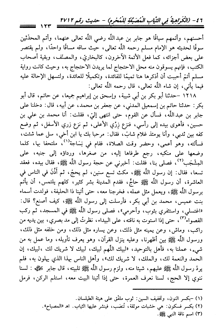 1218 - حدثنا أبو بكر بن أبي شيبة، وإسحق بن إبراهيم جميعا، عن حاتم، قال أبو بكر: حدثنا حاتم بن إسمعيل المدني، عن جعفر بن محمد، عن أبيه، قال: دخلنا على جابر بن عبد اللَّه، فسأل عن القوم، حتى انتهى إليّ، فقلت: أنا محمد بن علي بن حسين، فأهوى بيده إلى رأسي، فنزع زِرِّي الأعلى، ثم نزع زري الأسفل، ثم وضع كفه بين ثديي، وأنا يومئذ غلام شابّ، فقال: مرحبا بك يا ابن أخي، سل عما شئت، فسألته، وهو أعمى، وحضر وقت الصلاة، فقام في نِسَاجة (¬1)، ملتحفا بها، كلما وضعها على منكبه، رجع طرفاها إليه، من صغرها، ورداؤه إلى جنبه، على المِشْجَب (¬2)، فصلى بنا، فقلت: أخبرني عن حجة رسول اللَّه - صلى اللَّه عليه وسلم -، فقال بيده، فعقد تسعا، فقال: إن رسول اللَّه - صلى اللَّه عليه وسلم -، مكث تسع سنين، لم يحجّ، ثم أَذَّنَ في الناس في العاشرة، أن رسول اللَّه - صلى اللَّه عليه وسلم - حاجٌّ، فقدم المدينة بشر كثير، كلهم يلتمس، أن يأتم برسول اللَّه - صلى اللَّه عليه وسلم -، ويعمل مثل عمله، فخرجنا معه، حتى أتينا ذا الحليفة، فولدت أسماء بنت عميس، محمد بن أبي بكر، فأرسلت إلى رسول اللَّه - صلى اللَّه عليه وسلم -، كيف أصنع؟ قال: "اغتسلي، واستثفري بثوب، وأحرمي"، فصلى رسول اللَّه - صلى اللَّه عليه وسلم - في المسجد، ثم ركب القصواء (¬3)، حتى إذا استوت به ناقته، على البيداء، نظرتُ إلى مد بصري، بين يديه من راكب، وماش، وعن يمينه مثل ذلك، وعن يساره مثل ذلك، ومن خلفه مثل ذلك، ورسول اللَّه - صلى اللَّه عليه وسلم - بين أظهرنا، وعليه ينزل القرآن، وهو يعرف تأويله، وما عمل به من شيء، عملنا به، فأهل بالتوحيد، "لبيك اللهم لبيك، لبيك لا شريك لك، لبيك، إن الحمد والنعمة لك، والملك، لا شريك لك"، وأهل الناس بهذا الذي يهلون به، فلم يردّ رسول اللَّه - صلى اللَّه عليه وسلم - عليهم، شيئا منه، ولزم رسول اللَّه - صلى اللَّه عليه وسلم - تلبيته، قال جابر - رضي اللَّه عنه -: لسنا ننوي إلا الحج، لسنا نعرف العمرة، حتى إذا أتينا البيت معه، استلم الركن، فرمل