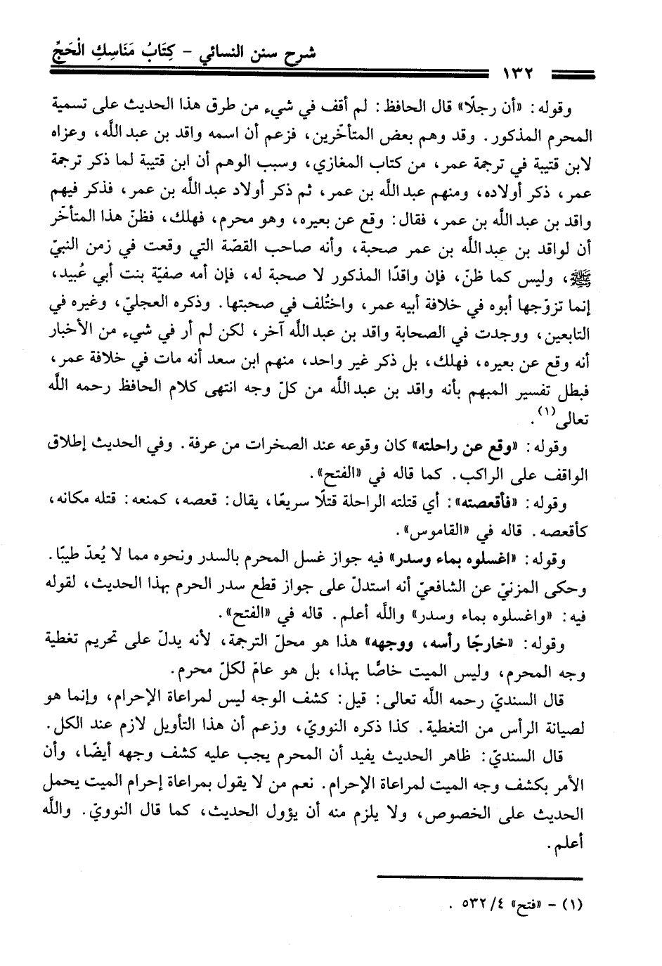 وقوله: "أن رجلاً" قال الحافظ: لم أقف في شيء من طرق هذا الحديث على تسمية المحرم المذكور. وقد وهم بعض المتأخّرين، فزعم أن اسمه واقد بن عبد اللَّه، وعزاه لابن قتيبة في ترجمة عمر، من كتاب المغازي، وسبب الوهم أن ابن قتيبة لما ذكر ترجمة عمر، ذكر أولاده، ومنهم عبد اللَّه بن عمر، ثم ذكر أولاد عبد اللَّه بن عمر، فذكر فيهم واقد بن عبد اللَّه بن عمر، فقال: وقع عن بعيره، وهو محرم، فهلك، فظنّ هذا المتأخّر أن لواقد بن عبد اللَّه بن عمر صحبة، وأنه صاحب القصّة التي وقعت في زمن النبيّ - صلى اللَّه عليه وسلم -، وليس كما ظنّ، فإن واقدًا المذكور لا صحبة له، فإن أمه صفيّة بنت أبي عُبيد، إنما تزوّجها أبوه في خلافة أبيه عمر، واختُلف في صحبتها. وذكره العجليّ، وغيره في التابعين، ووجدت في الصحابة واقد بن عبد اللَّه آخر، لكن لم أر في شيء من الأخبار أنه وقع عن بعيره، فهلك، بل ذكر غير واحد، منهم ابن سعد أنه مات في خلافة عمر، فبطل تفسير المبهم بأنه واقد بن عبد اللَّه من كلّ وجه انتهى كلام الحافظ -رَحِمَهُ اللَّهُ تَعَالَى- (¬1).