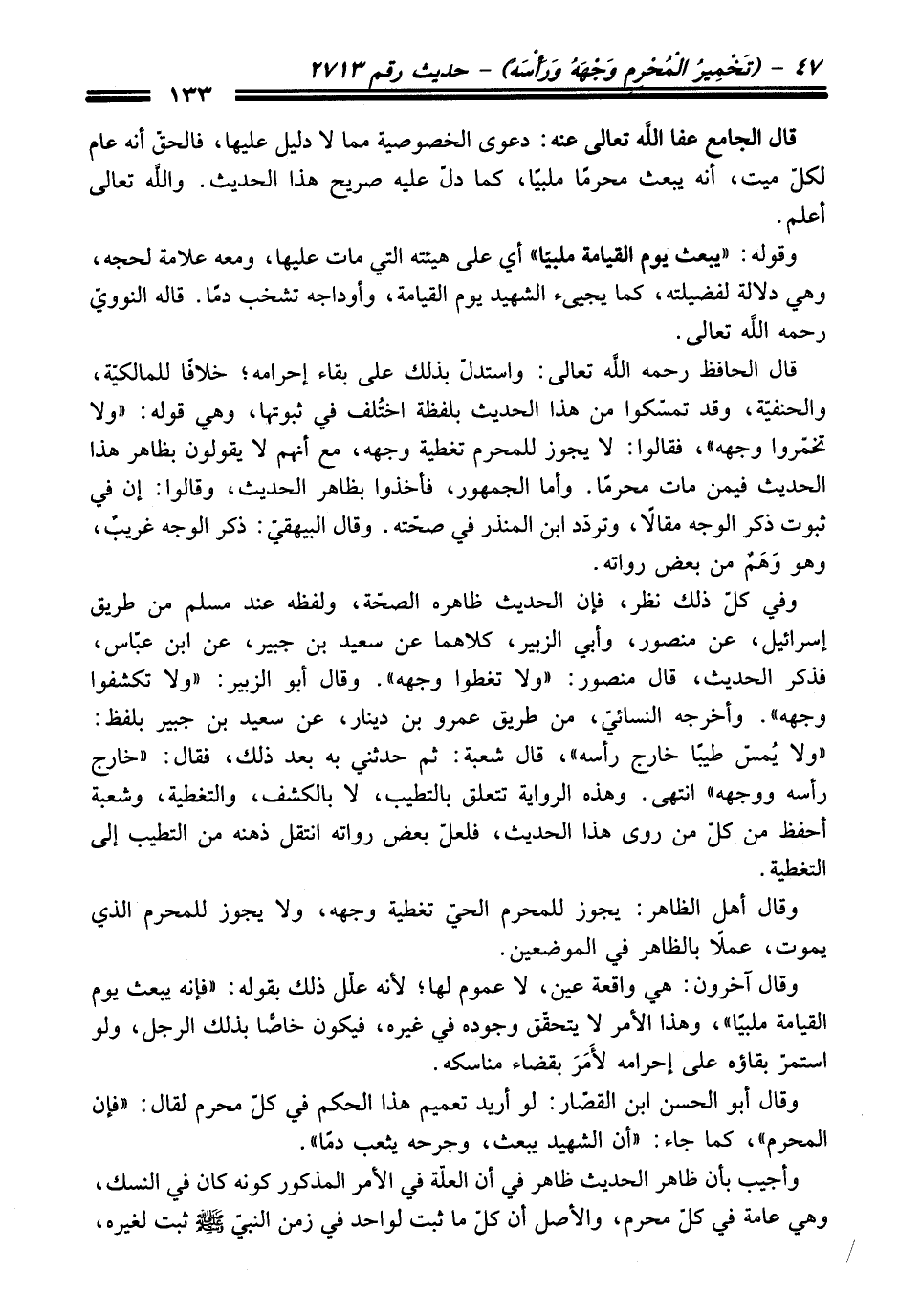 وفي كلّ ذلك نظر، فإن الحديث ظاهره الصحّة، ولفظه عند مسلم من طريق إسرائيل، عن منصور، وأبي الزبير، كلاهما عن سعيد بن جبير، عن ابن عبّاس، فذكر الحديث، قال منصور: "ولا تغطوا وجهه". وقال أبو الزبير: "ولا تكشفوا وجهه". وأخرجه النسائيّ، من طريق عمرو بن دينار، عن سعيد بن جبير بلفظ: "ولا يُمسّ طيبًا خارج رأسه"، قال شعبة: ثم حدثني به بعد ذلك، فقال: "خارج رأسه ووجهه" انتهى. وهذه الرواية تتعلق بالتطيب، لا بالكشف، والتغطية، وشعبة أحفظ من كلّ من روى هذا الحديث، فلعلّ بعض رواته انتقل ذهنه من التطيب إلى التغطية.
