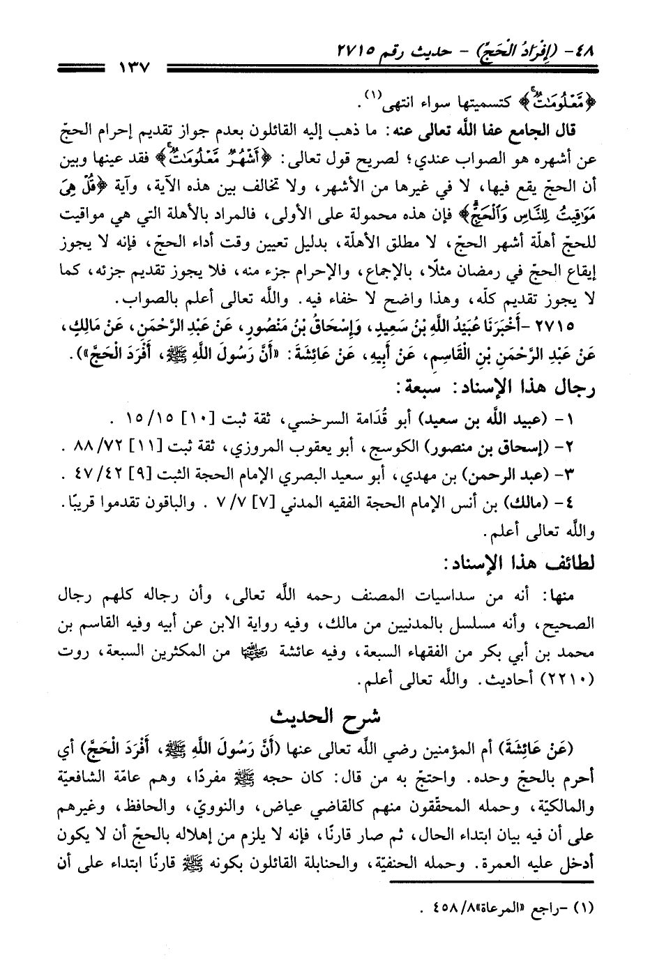 2715 - (أَخْبَرَنَا عُبَيْدُ اللَّهِ بْنُ سَعِيدٍ, وَإِسْحَاقُ بْنُ مَنْصُورٍ, عَنْ عَبْدِ الرَّحْمَنِ, عَنْ مَالِكٍ, عَنْ عَبْدِ الرَّحْمَنِ بْنِ الْقَاسِمِ, عَنْ أَبِيهِ, عَنْ عَائِشَةَ: "أَنَّ رَسُولَ اللَّهِ - صلى اللَّه عليه وسلم -, أَفْرَدَ الْحَجَّ").