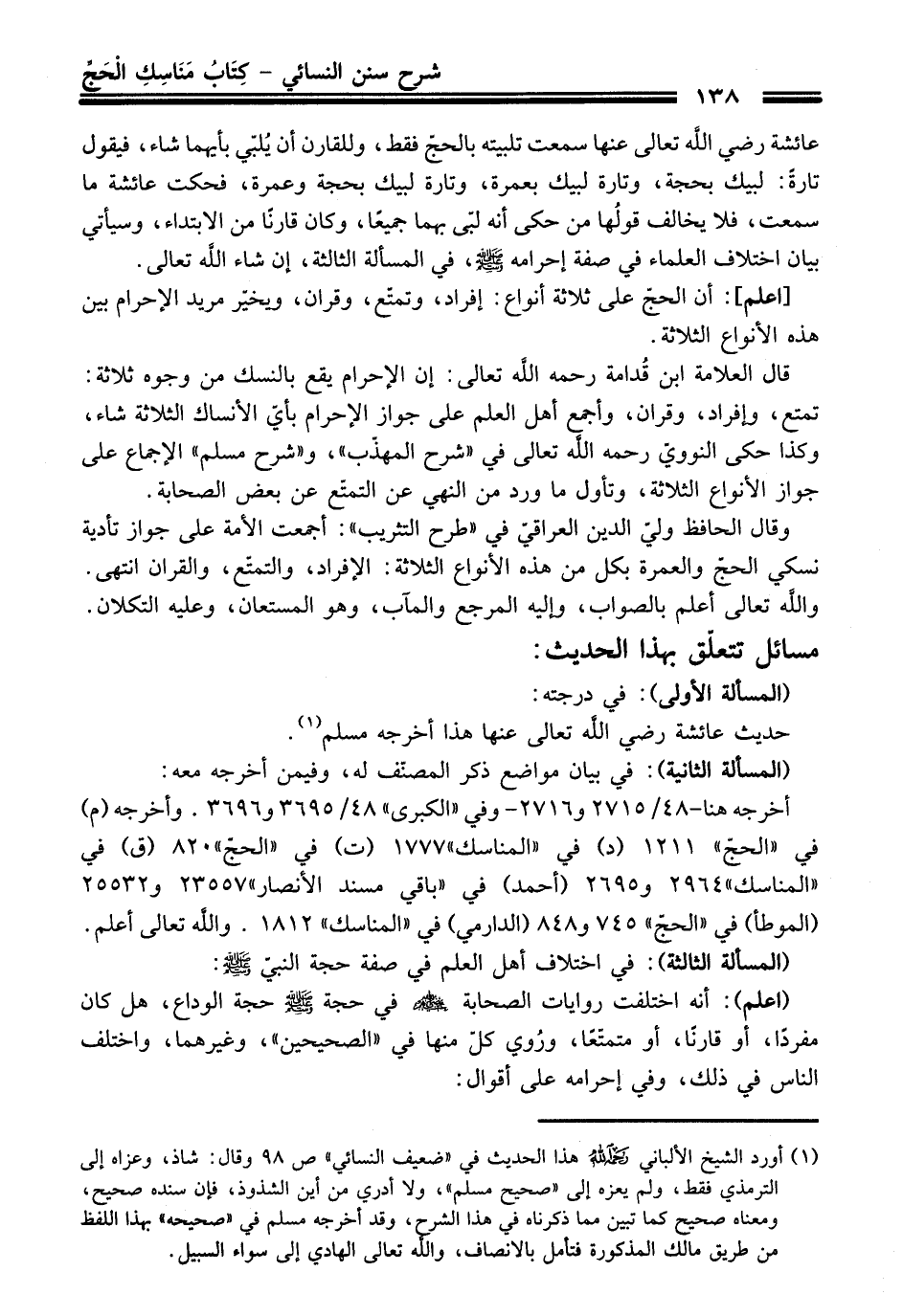 (¬1) أورد الشيخ الألباني -رَحِمَهُ اللَّهُ- هذا الحديث في "ضعيف النسائي" ص 98 وقال: شاذ، وعزاه إلى الترمذي فقط، ولم يعزه إلى "صحيح مسلم"، ولا أدري من أين الشذوذ، فإن سنده صحيح، ومعناه صحيح كما تبين مما ذكرناه في هذا الشرح، وقد أخرجه مسلم في "صحيحه" بهذا اللفظ من طريق مالك المذكورة فتأمل بالانصاف، واللَّه تعالى الهادي إلى سواء السبيل.