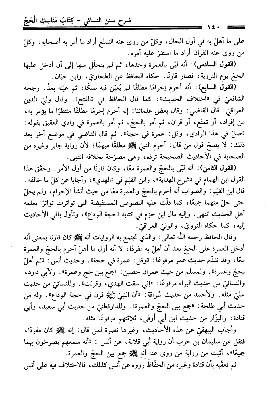 (القول الثامن): أنه لبّى بالحجّ والعمرة معًا، وكان قارنًا من أول الأمر. وحقّق هذا القول ابن الهمام في "شرح الهداية"، وابن القيّم في "الهدي"، وأجابا عن كلّ ما خالفه.
