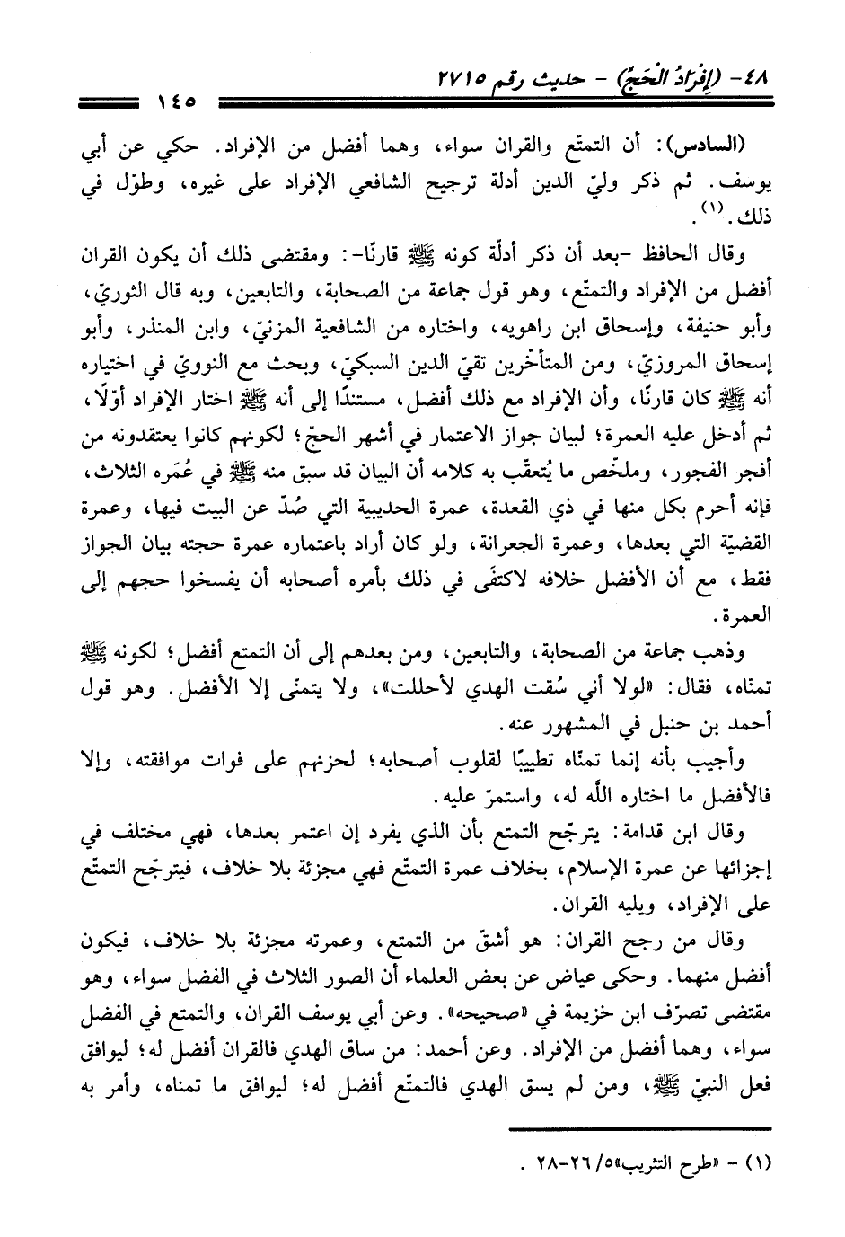 (السادس): أن التمتّع والقران سواء، وهما أفضل من الإفراد. حكي عن أبي يوسف. ثم ذكر وليّ الدين أدلة ترجيح الشافعي الإفراد على غيره، وطوّل في ذلك. (¬1).