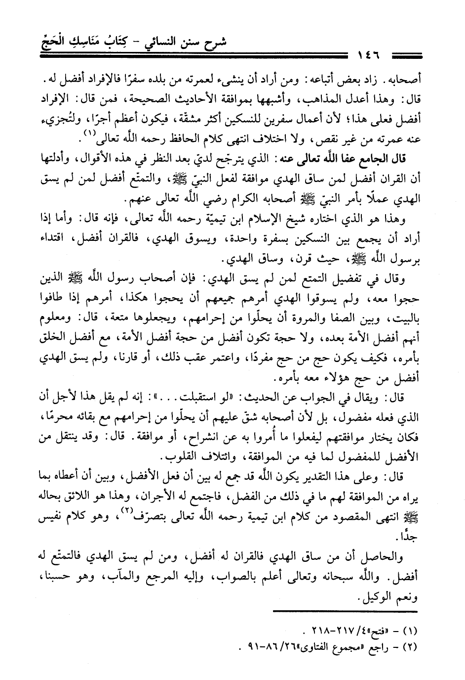 وهذا هو الذي اختاره شيخ الإسلام ابن تيمية -رحمه اللَّه تعالى-، فإنه قال: وأما إذا أراد أن يجمع بين النسكين بسفرة واحدة، ويسوق الهدي، فالقران أفضل، اقتداء برسول اللَّه - صلى اللَّه عليه وسلم -، حيث قرن، وساق الهدي.