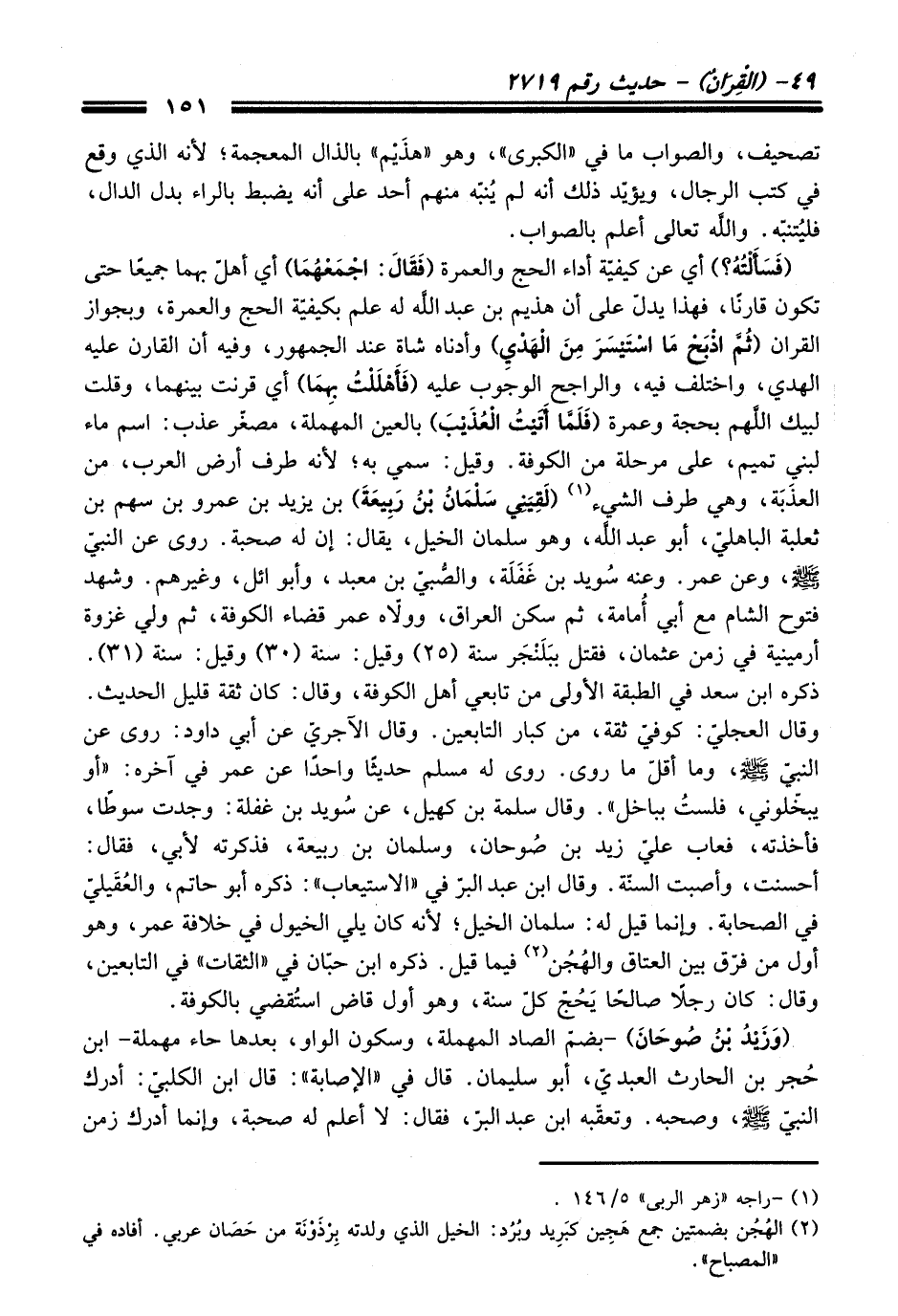 (فَسَاَلْتُهُ؟) أي عن كيفيّة أداء الحجّ والعمرة (فَقَالَ: اجْمَعْهُمَا) أي أهلّ بهما جميعًا حتى تكون قارنًا، فهذا يدلّ على أن هذيم بن عبد اللَّه له عدم بكيفيّة الحجّ والعمرة، وبجواز القرآن (ثمَّ اذْبَحْ مَا اسْتَيسَرَ مِنَ الْهَدْيِ) وأدناه شاة عند الجمهور، وفيه أن القارن عليه الهدي، واختلف فيه، والراجح الوجوب عليه (فَأَهْلَلْتُ بِهمَا) أي قرنت بينهما، وقلت لبيك اللَّهم بحجة وعمرة (فَلَمَّا أَتَيْتُ العُذَيْبَ) بالعين المهملة، مصغّر عذب: اسم ماء لبني تميم، على مرحلة من الكوفة. وقيل: سمي به؛ لأنه طرف أرض العرب، من العذَبَة، وهي طرف الشيء (¬1) (لَقِيَنِي سَلْمَانُ بْنُ رَبِيعَةَ) بن يزيد بن عمرو بن سهم بن ثعلبة الباهليّ، أبو عبد اللَّه، وهو سلمان الخيل، يقال: إن له صحبة. روى عن النبيّ - صلى اللَّه عليه وسلم -، وعن عمر. وعنه سُويد بن غَفَلَة، والصُّبيّ بن معبد، وأبو ائل، وغيرهم. وشهد فتوح الشام مع أبي أُمامة، ثم سكن العراق، وولاّه عمر قضاء الكوفة، ثم ولي غزوة أرمينية في زمن عثمان، فقتل ببَلَنْجَر سنة (25) وقيل: سنة (30) وقيل: سنة (31). ذكره ابن سعد في الطبقة الأولى من تابعي أهل الكوفة، وقال: كان ثقة قليل الحديث. وقال العجليّ: كوفي ثقة، من كبار التابعين. وقال الآجريّ عن أبي داود: روى عن النبيّ - صلى اللَّه عليه وسلم -، وما أقلّ ما روى. روى له مسلم حديثًا واحدًا عن عمر في آخره: "أو يبخّلوني، فلستُ بباخل". وقال سلمة بن كهيل، عن سُويد بن غفلة: وجدت سوطًا، فأخذته، فعاب عليّ زيد بن صُوحان، وسلمان بن ربيعة، فذكرته لأبي، فقال: أحسنت، وأصبت السنّة. وقال ابن عبد البرّ في "الاستيعاب": ذكره أبو حاتم، والعُقيليّ في الصحابة. وإنما قيل له: سلمان الخيل؛ لأنه كان يلي الخيول في خلافة عمر، وهو أول من فرّق بين العتاق والهُجُن (¬2) فيما قيل. ذكره ابن حبّان في "الثقات" في التابعين، وقال: كان رجلاً صالحًا يَحُجّ كلّ سنّة، وهو أول قاض استُقضي بالكوفة.