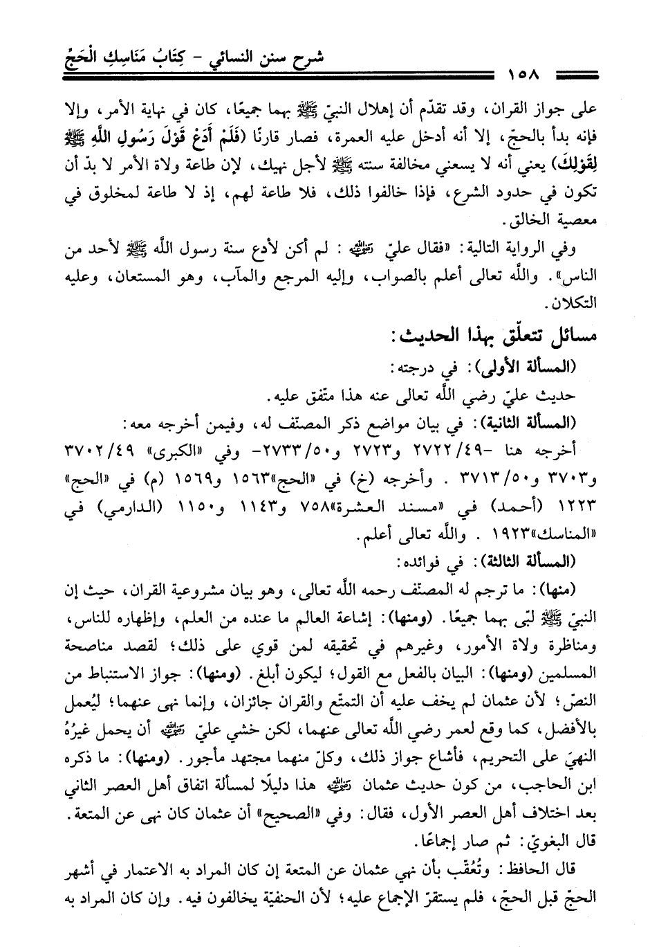 (منها): ما ترجم له المصنّف -رحمه اللَّه تعالى-، وهو بيان مشروعية القران، حيث إن النبيّ - صلى اللَّه عليه وسلم - لبّى بهما جميعًا. (ومنها): إشاعة العالم ما عنده من العلم، وإظهاره للناس، ومناظرة ولاة الأمور، وغيرهم في تحقيقه لمن قوي على ذلك؛ لقصد مناصحة المسلمين (ومنها): البيان بالفعل مع القول؛ ليكون أبلغ. (ومنها): جواز الاستنباط من النصّ؛ لأن عثمان لم يخف عليه أن التمتّع والقران جائزان، وإنما نهى عنهما؛ ليُعمل بالأفضل، كما وقع لعمر - رضي اللَّه تعالى عنهما -، لكن خشي عليّ - رضي اللَّه عنه - أن يحمل غيرُهُ النهيَ على التحريم، فأشاع جواز ذلك، وكلّ منهما مجتهد مأجور. (ومنها): ما ذكره ابن الحاجب، من كون حديث عثمان - رضي اللَّه عنه - هذا دليلاً لمسألة اتفاق أهل العصر الثاني بعد اختلاف أهل العصر الأول، فقال: وفي "الصحيح" أن عثمان كان نهى عن المتعة. قال البغويّ: ثم صار إجماعًا.