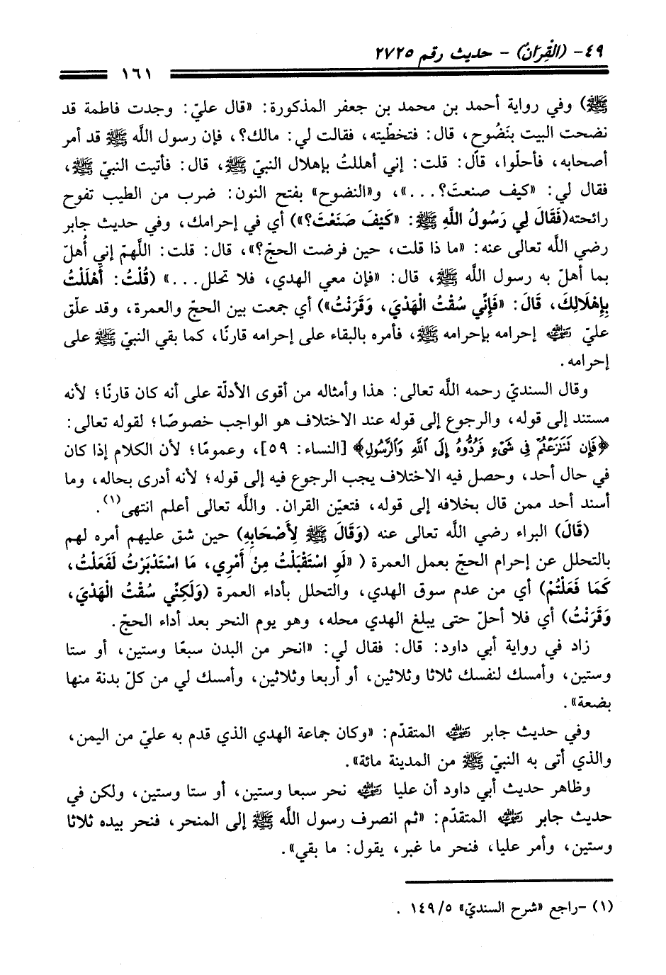 وقال السنديّ -رحمه اللَّه تعالى-: هذا وأمثاله من أقوى الأدلّة على أنه كان قارنًا؛ لأنه مستند إلى قوله، والرجوع إلى قوله عند الاختلاف هو الواجب خصوصًا؛ لقوله تعالى: {فَإِنْ تَنَازَعْتُمْ فِي شَيْءٍ فَرُدُّوهُ إِلَى اللَّهِ وَالرَّسُولِ} [النساء: 59]، وعمومًا؛ لأن الكلام إذا كان في حال أحد، وحصل فيه الاختلاف يجب الرجوع فيه إلى قوله؛ لأنه أدرى بحاله، وما أسند أحد ممن قال بخلافه إلى قوله، فتعيّن القران. واللَّه تعالى أعلم انتهى (¬1).
