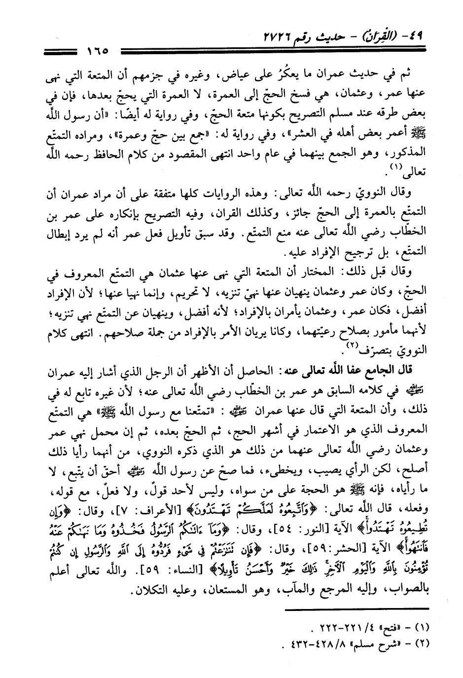 وقال النوويّ -رحمه اللَّه تعالى-: وهذه الروايات كلها متفقة على أن مراد عمران أن التمتّع بالعمرة إلى الحجّ جائز، وكذلك القران، وفيه التصريح بإنكاره على عمر بن الخطّاب - رضي اللَّه تعالى عنه - منع التمتّع. وقد سبق تأويل فعل عمر أنه لم يرد إبطال التمتّع، بل ترجيح الإفراد عليه.