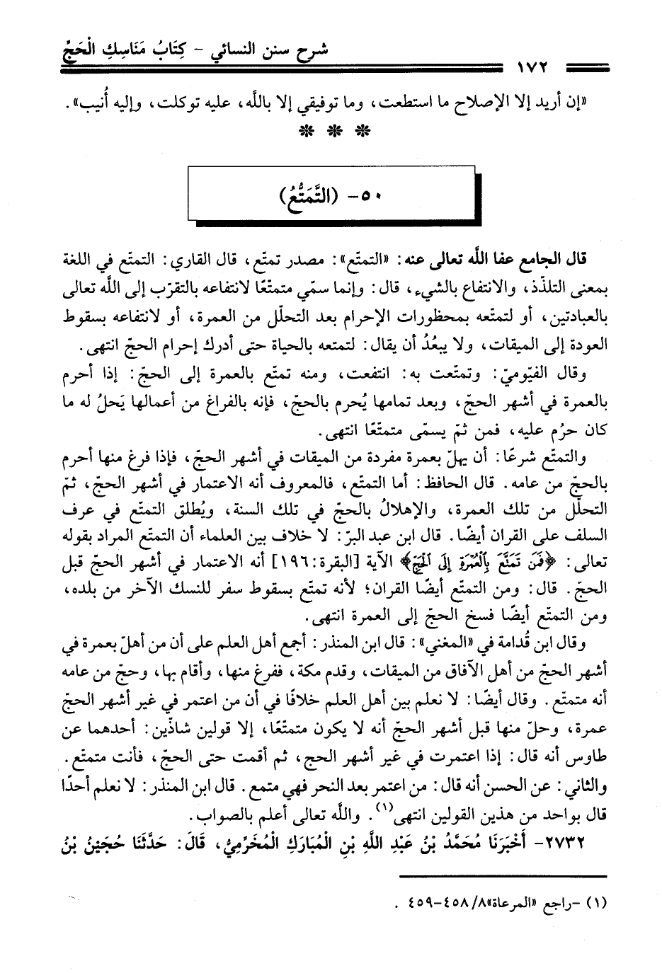 قال الجامع - عفا اللَّه تعالى عنه -: "التمتّع": مصدر تمتّع، قال القاري: التمتّع في اللغة بمعنى التلذّذ، والانتفاع بالشيء، قال: وإنما سمّي متمتّعًا لانتفاعه بالتقرّب إلى اللَّه تعالى بالعبادتين، أو لتمتّعه بمحظورات الإحرام بعد التحلّل من العمرة، أو لانتفاعه بسقوط العودة إلى الميقات، ولا يبعُدُ أن يقال: لتمتعه بالحياة حتى أدرك إحرام الحجّ انتهى.