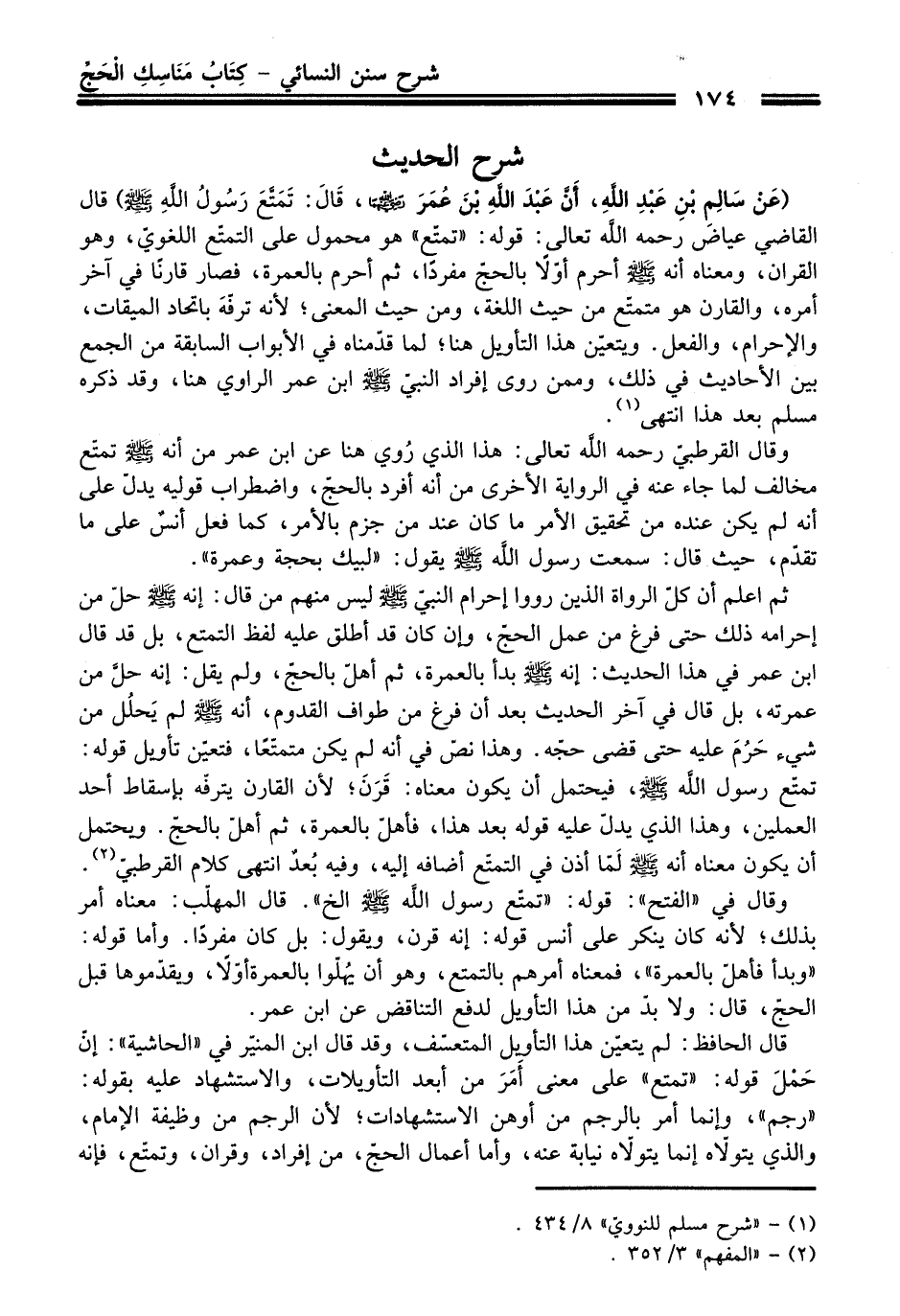 ثم اعلم أن كلّ الرواة الذين رووا إحرام النبيّ - صلى اللَّه عليه وسلم - ليس منهم من قال: إنه - صلى اللَّه عليه وسلم - حلّ من إحرامه ذلك حتى فرغ من عمل الحجّ، وإن كان قد أطلق عليه لفظ التمتع، بل قد قال ابن عمر في هذا الحديث: إنه - صلى اللَّه عليه وسلم - بدأ بالعمرة، ثم أهلّ بالحجّ، ولم يقل: إنه حلَّ من عمرته، بل قال في آخر الحديث بعد أن فرغ من طواف القدوم، أنه - صلى اللَّه عليه وسلم - لم يَحلُل من شيء حَرُمَ عليه حتى قضى حجّه. وهذا نصّ في أنه لم يكن متمتّعًا، فتعيّن تأويل قوله: تمتّع رسول اللَّه - صلى اللَّه عليه وسلم -، فيحتمل أن يكون معناه: قَرَنَ؛ لأن القارن يترفّه بإسقاط أحد العملين، وهذا الذي يدلّ عليه قوله بعد هذا، فأهلّ بالعمرة، ثم أهلّ بالحجّ. ويحتمل أن يكون معناه أنه - صلى اللَّه عليه وسلم - لَمّا أذن في التمتّع أضافه إليه، وفيه بُعدٌ انتهى كلام القرطبيّ (¬2).