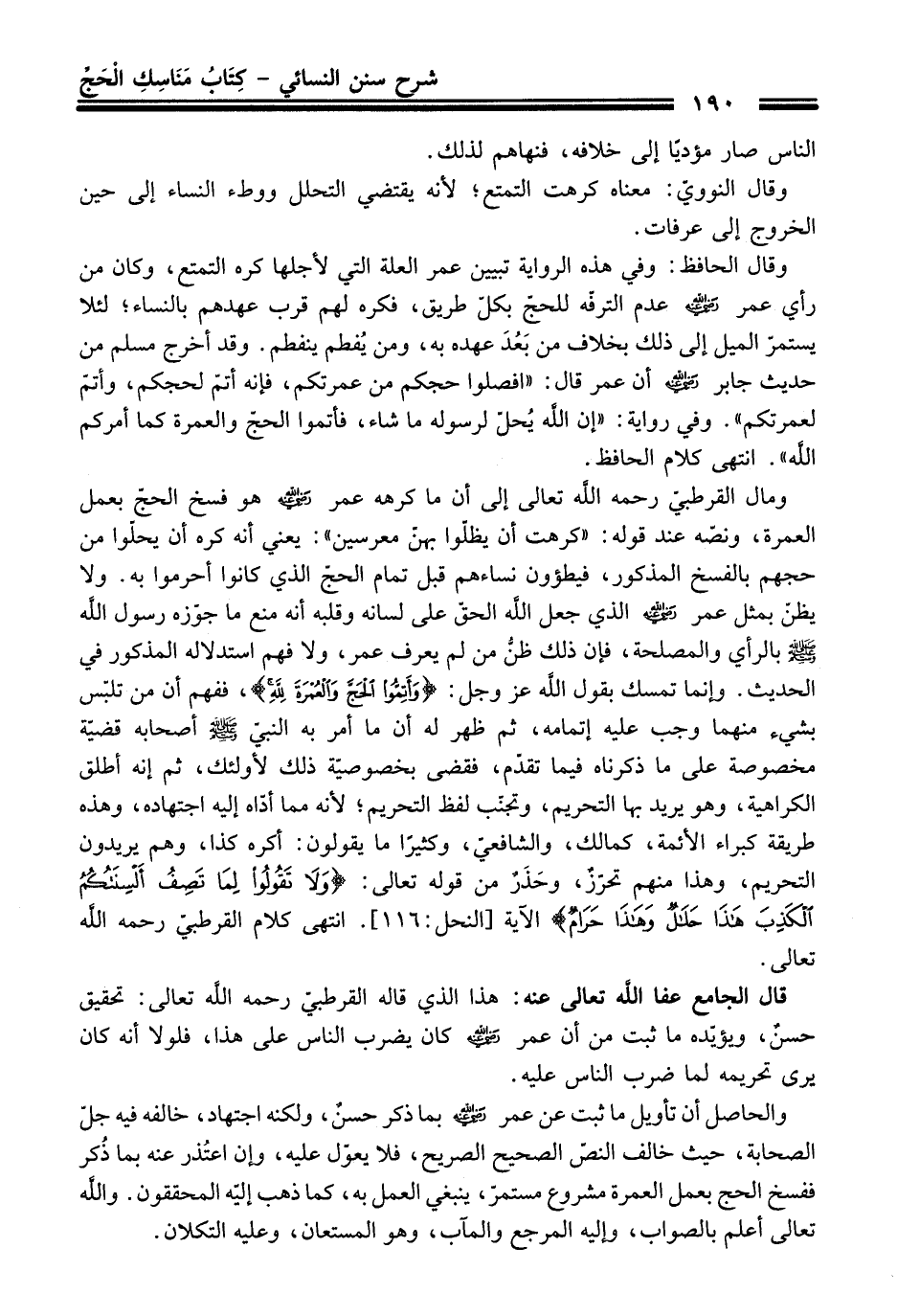 ومال القرطبيّ -رحمه اللَّه تعالى- إلى أن ما كرهه عمر - رضي اللَّه عنه - هو فسخ الحجّ بعمل العمرة، ونصّه عند قوله: "كرهت أن يظلّوا بهنّ معرسين": يعني أنه كره أن يحلّوا من حجهم بالفسخ المذكور، فيطؤون نساءهم قبل تمام الحجّ الذي كانوا أحرموا به. ولا يظنّ بمثل عمر - رضي اللَّه عنه - الذي جعل اللَّه الحقّ على لسانه وقلبه أنه منع ما جوّزه رسول اللَّه - صلى اللَّه عليه وسلم - بالرأي والمصلحة، فإن ذلك ظنُّ من لم يعرف عمر، ولا فهم استدلاله المذكور في الحديث. وإنما تمسك بقول اللَّه -عَزَّ وَجَلَّ-: {وَأَتِمُّوا الْحَجَّ وَالْعُمْرَةَ لِلَّهِ}، ففهم أن من تلبّس بشيء منهما وجب عليه إتمامه، ثم ظهر له أن ما أمر به النبيّ - صلى اللَّه عليه وسلم - أصحابه قضيّة مخصوصة على ما ذكرناه فيما تقدّم، فقضى بخصوصيّة ذلك لأولئك، ثم إنه أطلق الكراهية، وهو يريد بها التحريم، وتجنّب لفظ التحريم؛ لأنه مما أدّاه إليه اجتهاده، وهذه طريقة كبراء الأئمة، كمالك، والشافعيّ، وكثيرًا ما يقولون: أكره كذا، وهم يريدون التحريم، وهذا منهم تحرّزٌ، وحَذَرٌ من قوله تعالى: {وَلَا تَقُولُوا لِمَا تَصِفُ أَلْسِنَتُكُمُ الْكَذِبَ هَذَا حَلَالٌ وَهَذَا حَرَامٌ} الآية [النحل: 116]. انتهى كلام القرطبيّ -رَحِمَهُ اللَّهُ تَعَالَى-.