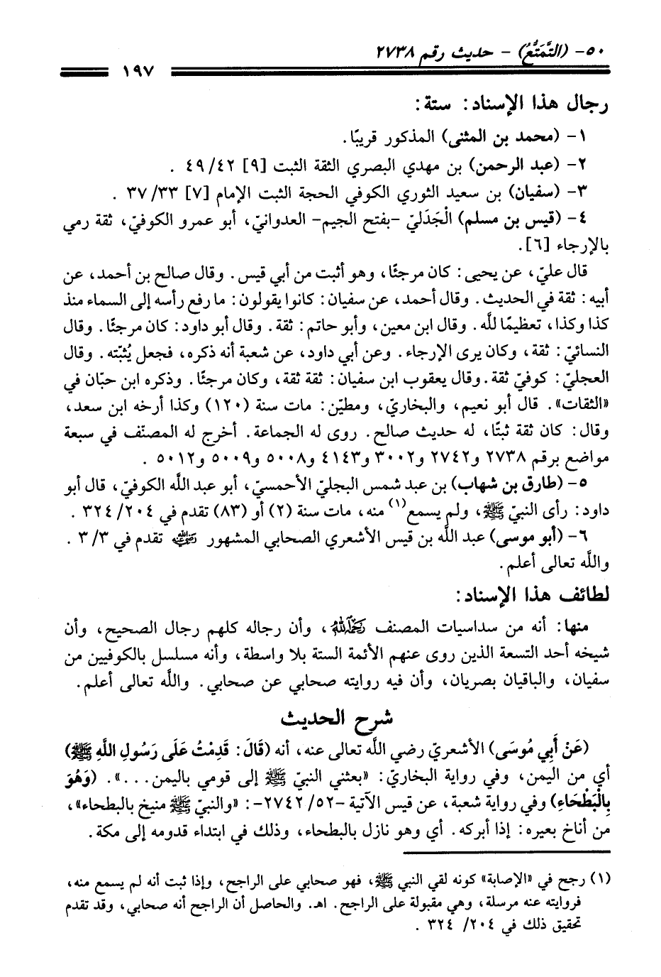 (عَنْ أَبِي مُوسَى) الأشعريّ - رضي اللَّه تعالى عنه -، أنه (قَالَ: قَدِمْتُ عَلَى رَسُولِ اللَّهِ - صلى اللَّه عليه وسلم -) أي من اليمن، وفي رواية البخاريّ: "بعثني النبيّ - صلى اللَّه عليه وسلم - إلى قومي باليمن ... ". (وَهُوَ بالبَطْحَاءِ) وفي رواية شعبة، عن قيس الآتية -52/ 2742 - : "والنبيّ - صلى اللَّه عليه وسلم - منيخ بالبطحاء"، مَن أناخ بعيره: إذا أبركه. أي وهو نازل بالبطحاء، وذلك في ابتداء قدومه إلى مكة.