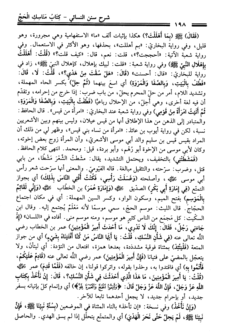 (فَقَالَ) - صلى اللَّه عليه وسلم - (بِمَا أَهْلَلْتَ؟) هكذا بإثبات ألف "ما" الاستفهامية وهي مجرورة، وهو قليل، وفي رواية البخاريّ: "بم أهللت"، بحذفها، وهو الأكثر في الاستعمال. وفي رواية شعبة الآتية: "أحججت؟ "، قلت: نعم، قال: "كيف قلت؟ " (قُلْتُ: أَهْلَلْتُ بِإِهْلالِ النَّبِيِّ - صلى اللَّه عليه وسلم -) وفي رواية شعبة: "قلت: لبيك بإهلال، كإهلال النبيّ - صلى اللَّه عليه وسلم - "، زاد في رواية للبخاريّ: "قال: أحسنت" (قَالَ: "هَلْ سُقْتَ مِنْ هَدْي؟ "، قُلْتُ: لا، قَالَ: "فَطُفْ بالْبَيتِ، وَبِالصَّفَا وَالْمَرْوَةِ) أي اسعَ بينهما (ثُمَّ حِلَّ) بكسر الحاء المهملة، وتشديد اللام، أمر من حلّ المحرم يحلّ، من باب ضرب: إذا خرج من إحرامه، وتقدّم أن فيه لغة أخرى، وهي أَحِلّ، من الإحلال رباعيًّا (فَطُفْتُ بالْبَيْتِ، وَبالصَّفَا وَالْمَرْوَةِ، ثُمَّ أَتَيْتُ امْرَأَةَ مِنْ قَوْمِي) وفي رواية شعبة عند البخاريّ: "امرأَة من قيس". قال الحافظ: والمتبادر إلى الذهن من هذا الإطلاق أنها من قيس عيلان، وليس بينهم وبين الأشعريين نسبة، لكن في رواية أيوب بن عائذ: "امرأة من نساء بني قيس"، وظهر لي من ذلك أن المراد بقيس قيس بن سليم والد أبي موسى الأشعريّ، وأن المرأة زوج بعض إخوته، وكان لأبي موسى من الإخوة أبو رُهْم، وأبو بردة، قيل: ومحمد. انتهى كلام الحافظ.