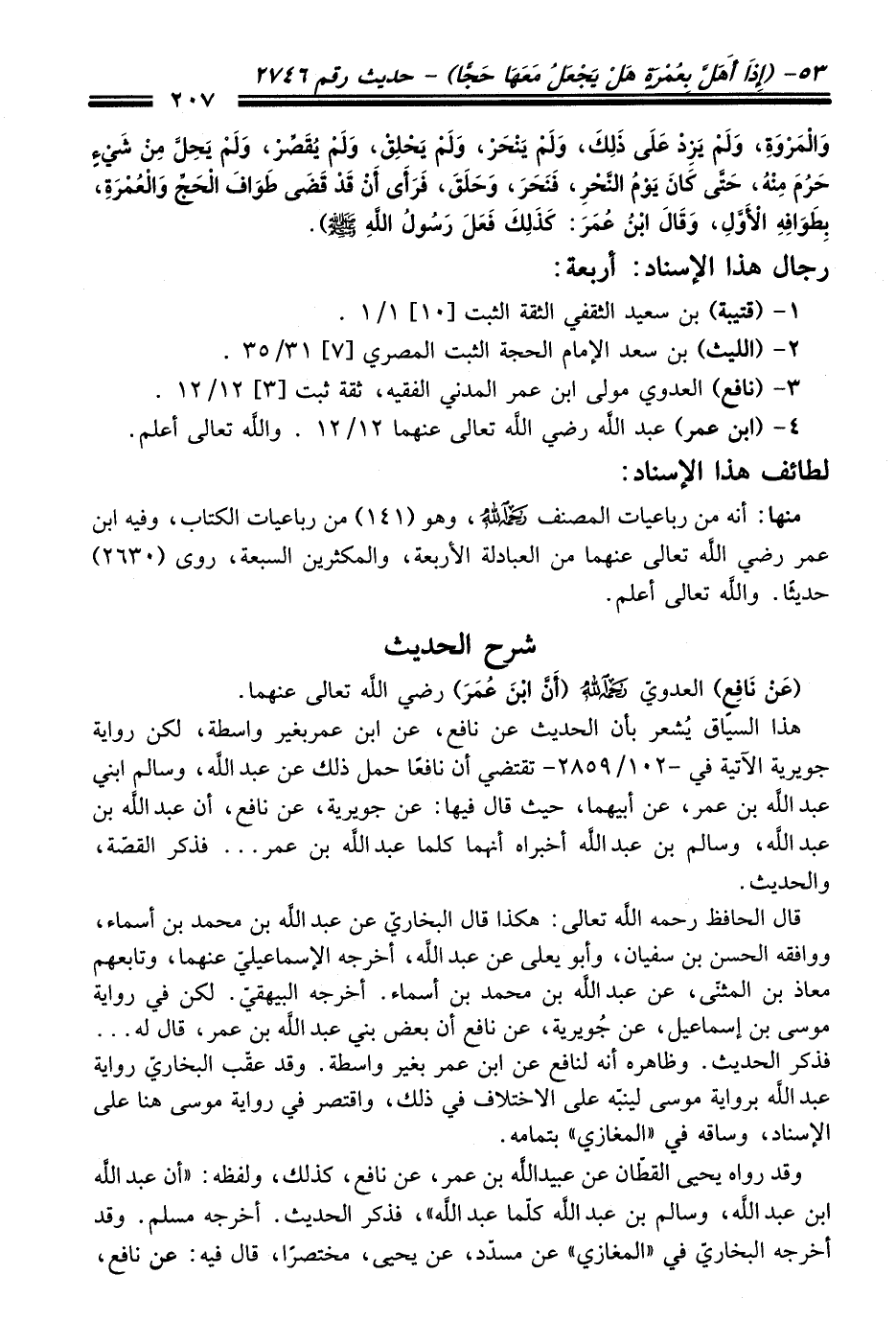 هذا السياق يُشعر بأن الحديث عن نافع، عن ابن عمر بغير واسطة، لكن رواية جويرية الآتية في -102/ 2859 - تقتضي أن نافعًا حمل ذلك عن عبد اللَّه، وسالم ابني عبد اللَّه بن عمر، عن أبيهما، حيث قال فيها: عن جويرية، عن نافع، أن عبد اللَّه بن عبد اللَّه، وسالم بن عبد اللَّه أخبراه أنهما كلما عبد اللَّه بن عمر ... فذكر القصّة، والحديث.