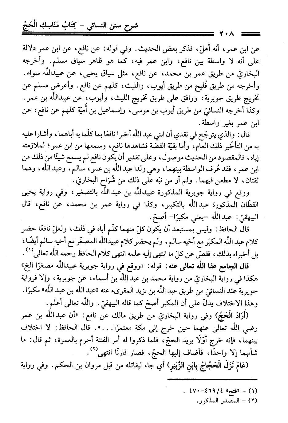 قال: والذي يترجّح في نقدي أن ابني عبد اللَّه أخبرا نافعًا بما كلّما به أباهما، وأشارا عليه به من التأخّير ذلك العام، وأما بقيّة الفضّة فشاهدها نافع، وسمعها من ابن عمر؛ لملازمته إياه، فالمقصود من الحديث موصول، وعلى تقدير أن يكون نافع لم يسمع شيئًا من ذلك من ابن عمر، فقد عُرف الواسطة بينهما، وهي ولدا عبد اللَّه بن عمر، سالم، وعبد اللَّه، وهما ثقتان، لا مطعن فيهما. ولم أر من نبّه على ذلك من شُرّاح البخاريّ.