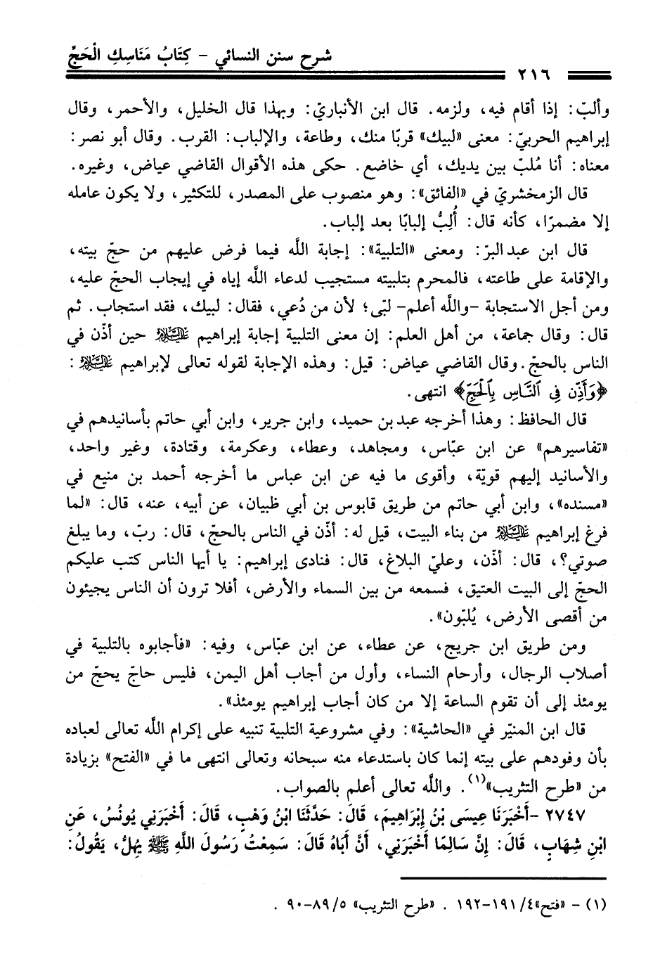 قال الحافظ: وهذا أخرجه عبد بن حميد، وابن جرير، وابن أبي حاتم بأسانيدهم في "تفاسيرهم" عن ابن عبّاس، ومجاهد، وعطاء، وعكرمة، وقتادة، وغير واحد، والأسانيد إليهم قويّة، وأقوى ما فيه عن ابن عباس ما أخرجه أحمد بن منيع في "مسنده"، وابن أبي حاتم من طريق قابوس بن أبي ظبيان، عن أبيه، عنه، قال: "لما فرغ إبراهيم - عليه السلام - من بناء البيت، قيل له: أذّن في الناس بالحجّ، قال: ربّ، وما يبلغ صوتي؟، قال: أذّن، وعلي البلاغ، قال: فنادى إبراهيم: يا أيها الناس كتب عليكم الحجّ إلى البيت العتيق، فسمعه من بين السماء والأرض، أفلا ترون أن الناس يجيئون من أقصى الأرض، يُلبّون".