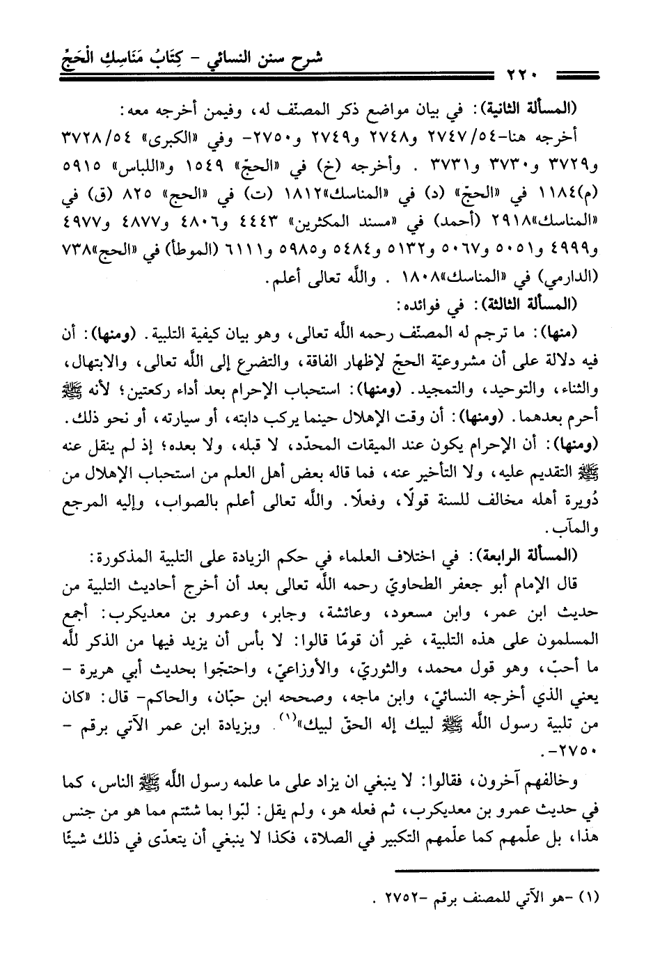 قال الإمام أبو جعفر الطحاويّ -رحمه اللَّه تعالى- بعد أن أخرج أحاديث التلبية من حديث ابن عمر، وابن مسعود، وعائشة، وجابر، وعمرو بن معديكرب: أجمع المسلمون على هذه التلبية، غير أن قوماً قالوا: لا بأس أن يزيد فيها من الذكر للَّه ما أحبّ، وهو قول محمد، والثوريّ، والأوزاعيّ، واحتجّوا بحديث أبي هريرة - يعني الذي أخرجه النسائيّ، وابن ماجه، وصححه ابن حبّان، والحاكم- قال: "كان من تلبية رسول اللَّه - صلى اللَّه عليه وسلم - لبيك إله الحقّ لبيك" (¬1) وبزيادة ابن عمر الآتي برقم - 2750 - .
