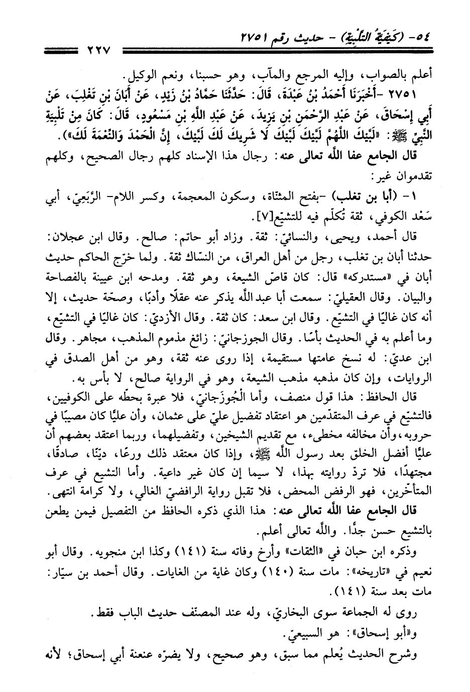 2751 - (أَخْبَرَنَا أَحْمَدُ بْنُ عَبْدَةَ, قَالَ: حَدَّثَنَا حَمَّادُ بْنُ زَيْدٍ, عَنْ أَبَانَ بْنِ تَغْلِبَ, عَنْ أَبِي إِسْحَاقَ, عَنْ عَبْدِ الرَّحْمَنِ بْنِ يَزِيدَ, عَنْ عَبْدِ اللَّهِ بْنِ مَسْعُودٍ, قَالَ: كَانَ مِنْ تَلْبِيَةِ النَّبِيِّ - صلى اللَّه عليه وسلم -: «لَبَّيْكَ اللَّهُمَّ لَبَّيْكَ لَبَّيْكَ لاَ شَرِيكَ لَكَ لَبَّيْكَ, إِنَّ الْحَمْدَ وَالنِّعْمَةَ لَكَ»).