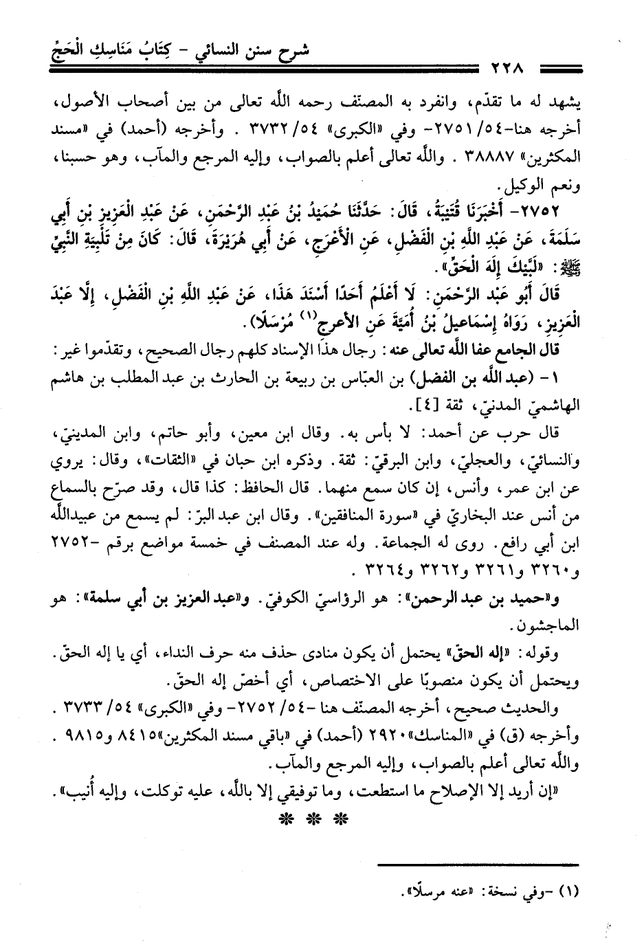 2752 - (أَخْبَرَنَا قُتَيْبَةُ, قَالَ: حَدَّثَنَا حُمَيْدُ بْنُ عَبْدِ الرَّحْمَنِ, عَنْ عَبْدِ الْعَزِيزِ بْنِ أَبِي سَلَمَةَ, عَنْ عَبْدِ اللَّهِ بْنِ الْفَضْلِ, عَنِ الأَعْرَجِ, عَنْ أَبِي هُرَيْرَةَ, قَالَ: كَانَ مِنْ تَلْبِيَةِ النَّبِيِّ - صلى اللَّه عليه وسلم -: «لَبَّيْكَ إِلَهَ الْحَقِّ».
